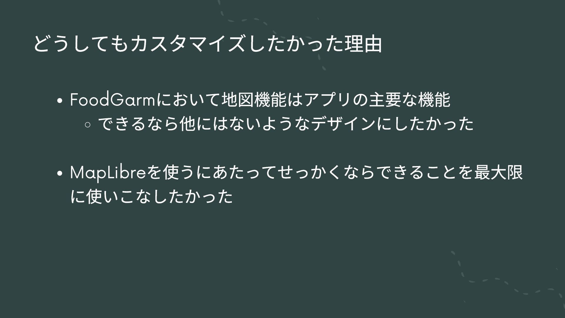 FoodGarm において地図機能はアプリの主要な機能 できるなら他にはないようなデザインにしたかった MapLibre を使うにあたってせっかくならできることを最大限 に使いこなしたかった どうしてもカスタマイズしたかった理由