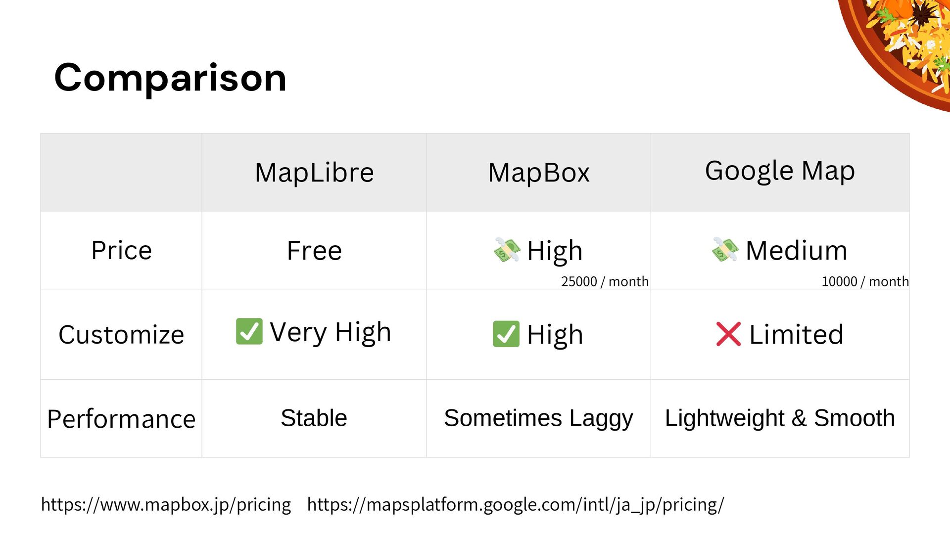Customize ✅ Very High ✅ High ❌ Limited Performance Stable Sometimes Laggy Lightweight & Smooth Comparison 10000 / month 25000 / month https://mapsplatform.google.com/intl/ja_jp/pricing/ https://www.mapbox.jp/pricing