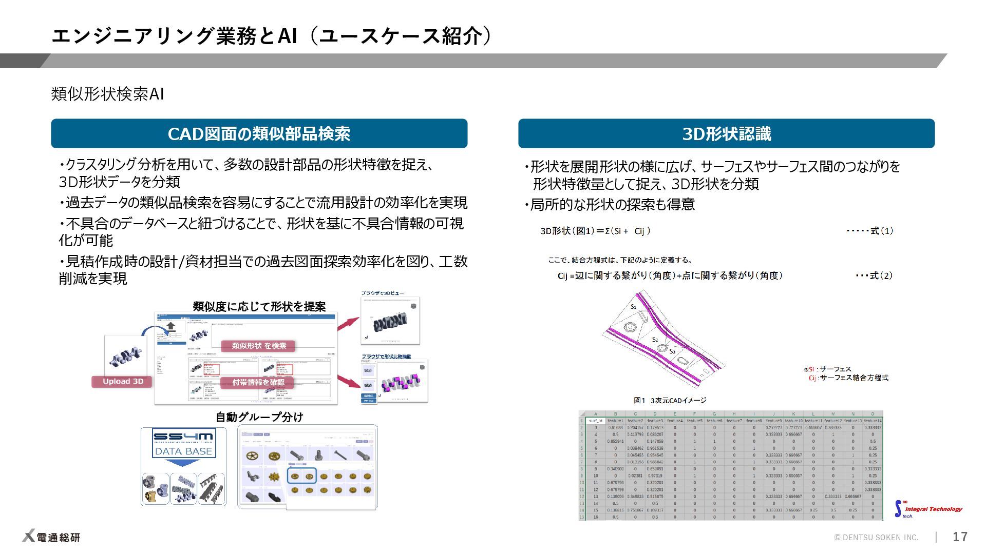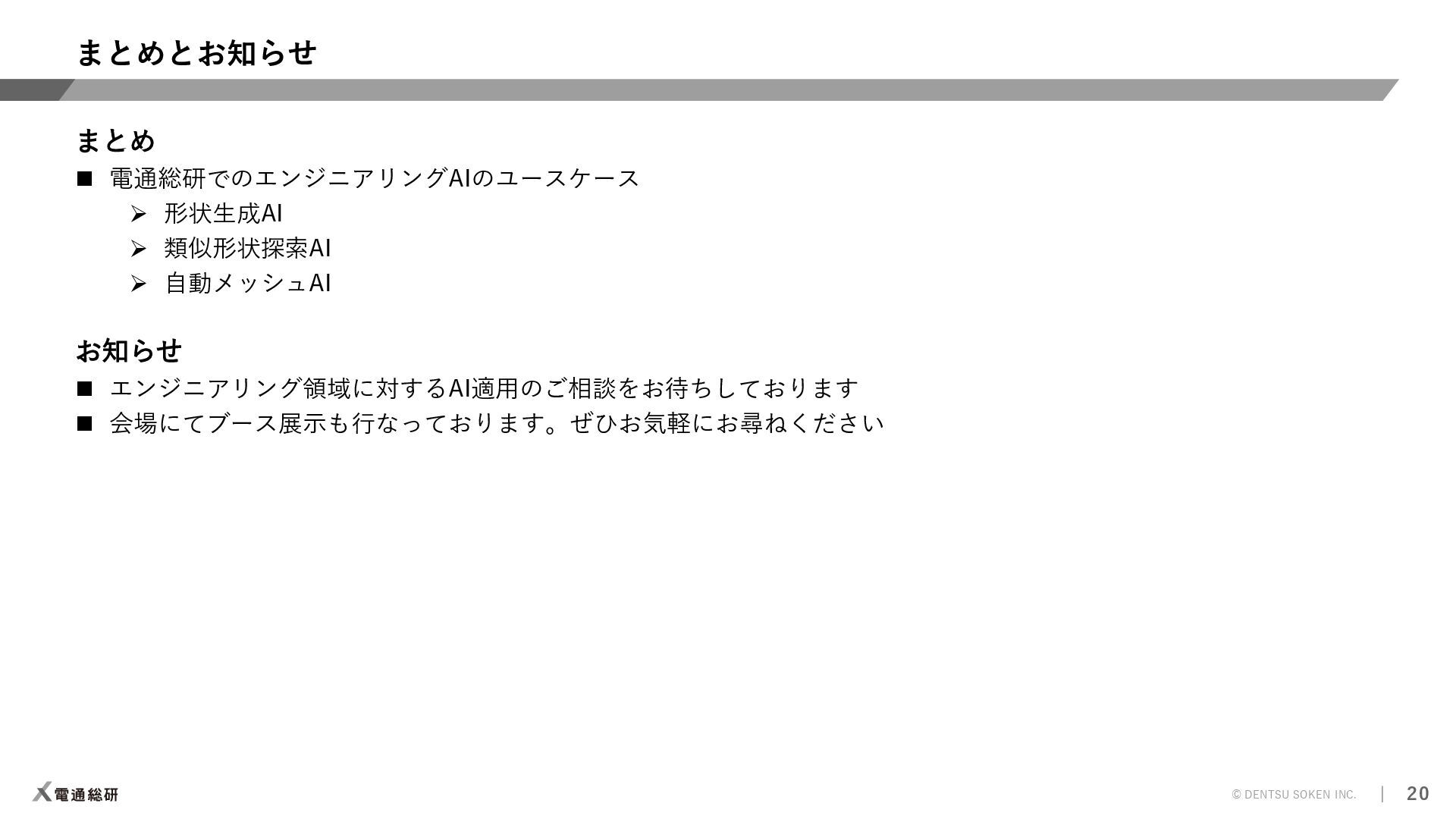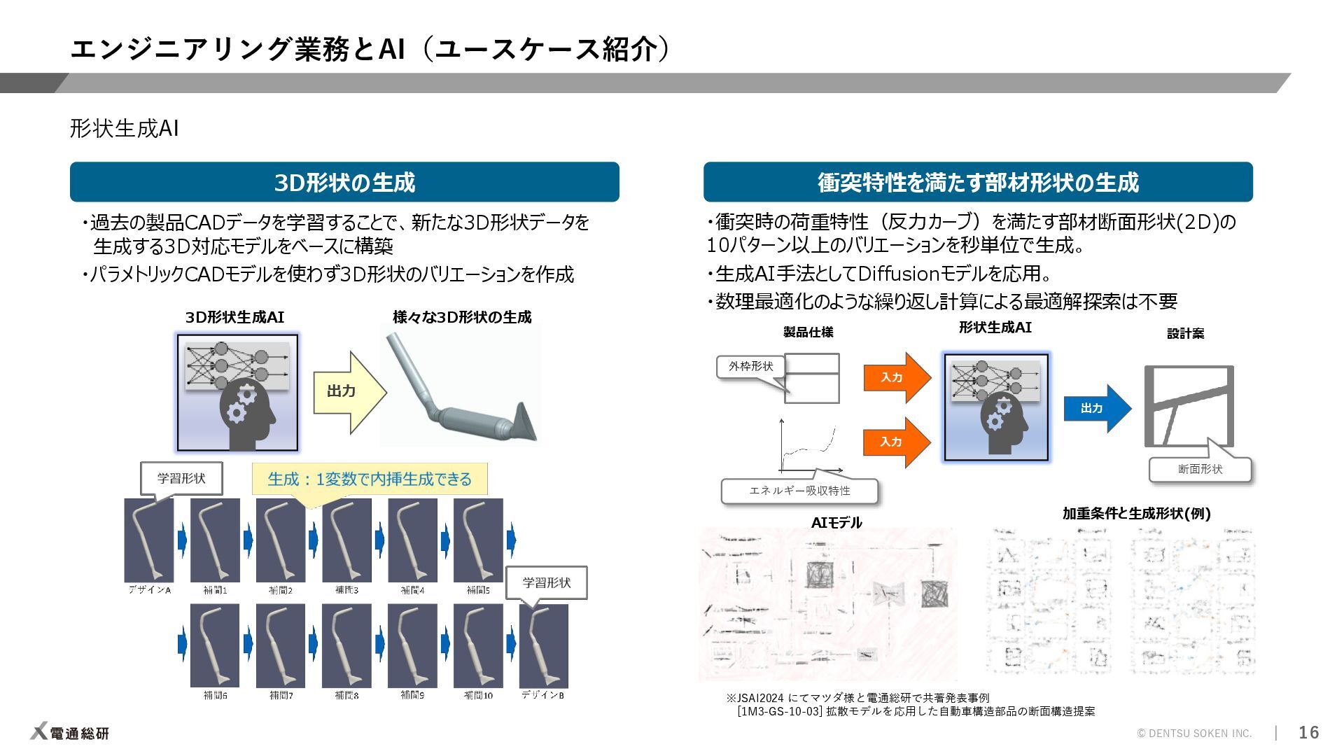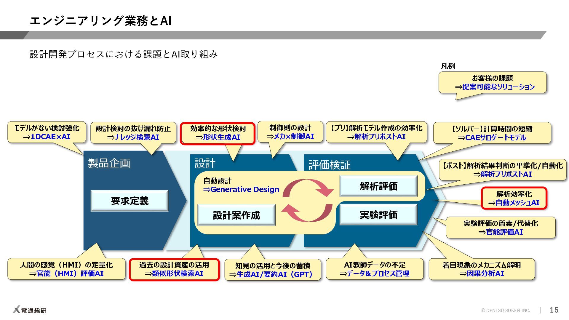 ⇒解析プリポストAI 【ソルバー】計算時間の短縮 ⇒CAEサロゲートモデル 【ポスト】解析結果判断の平準化/自動化 ⇒解析プリポストAI 人間の感覚(HMI)の定量化 ⇒官能(HMI)評価AI 設計検討の抜け漏れ防止 ⇒ナレッジ検索AI AI教師データの不足 ⇒データ&プロセス管理 知見の活用と今後の蓄積 ⇒生成AI/要約AI(GPT) 効率的な形状検討 ⇒形状生成AI 着目現象のメカニズム解明 ⇒因果分析AI 実験評価の簡素/代替化 ⇒官能評価AI 評価検証 実験評価 設計 自動設計 ⇒Generative Design 解析評価 設計案作成 制御則の設計 ⇒メカ×制御AI 過去の設計資産の活用 ⇒類似形状検索AI 解析効率化 ⇒自動メッシュAI モデルがない検討強化 ⇒1DCAE×AI お客様の課題 ⇒提案可能なソリューション 凡例
