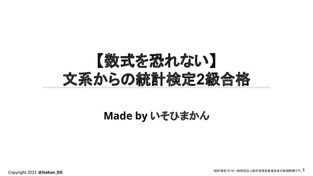 Copyright 2023 @Isokan_DD 1 【数式を恐れない】 文系からの統計検定2級合格 Made by いそひまかん 1