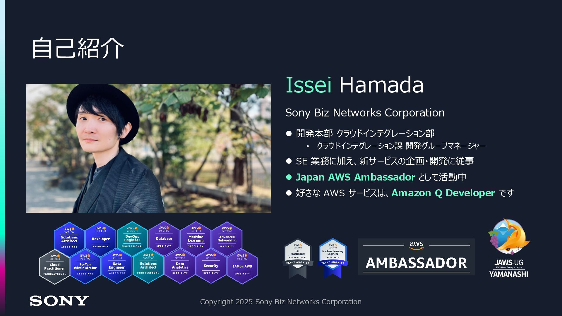 開発グループマネージャー ⚫ SE 業務に加え、新サービスの企画・開発に従事 ⚫ Japan AWS Ambassador として活動中 ⚫ 好きな AWS サービスは、Amazon Q Developer です Copyright 2025 Sony Biz Networks Corporation Issei Hamada