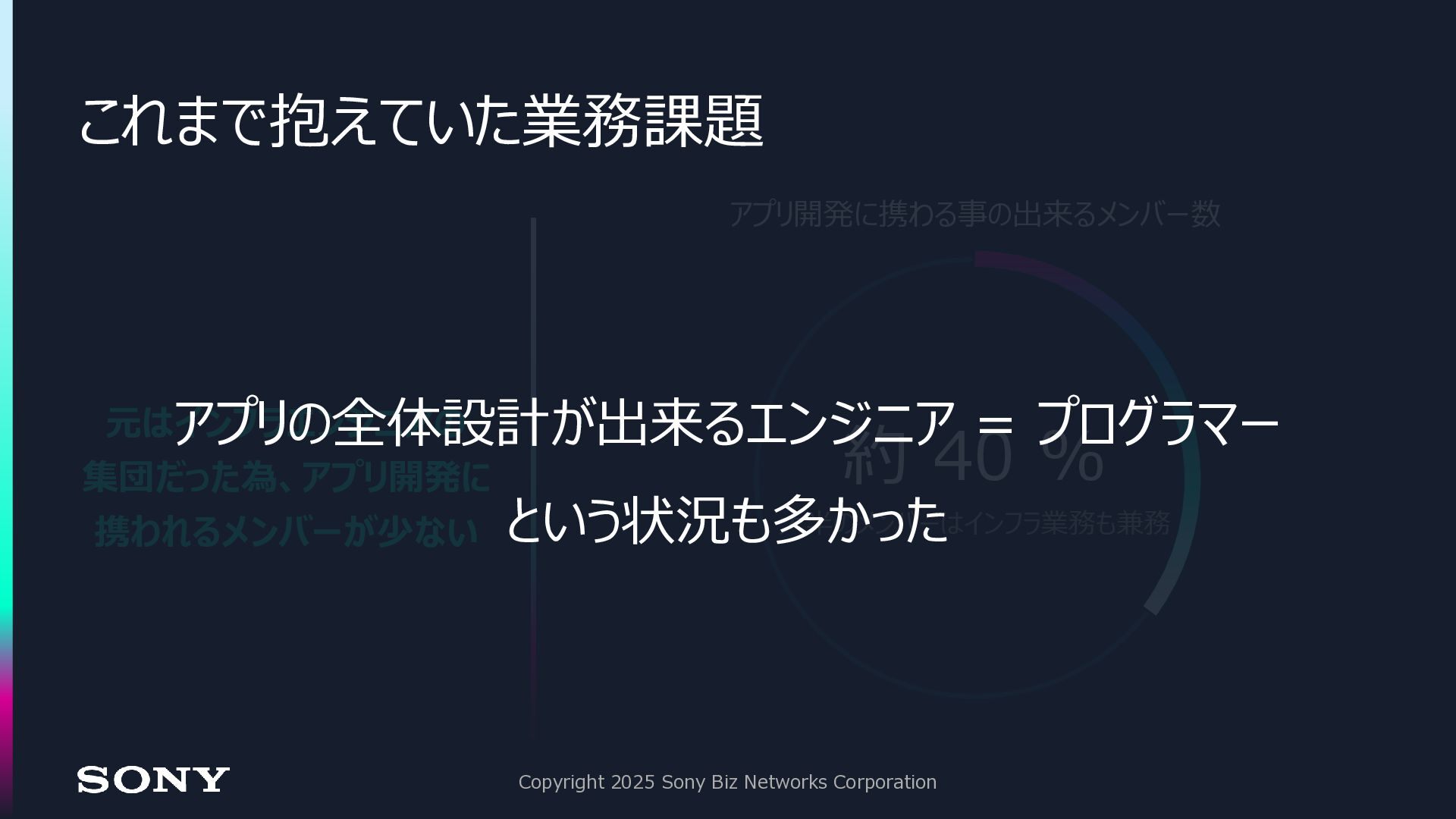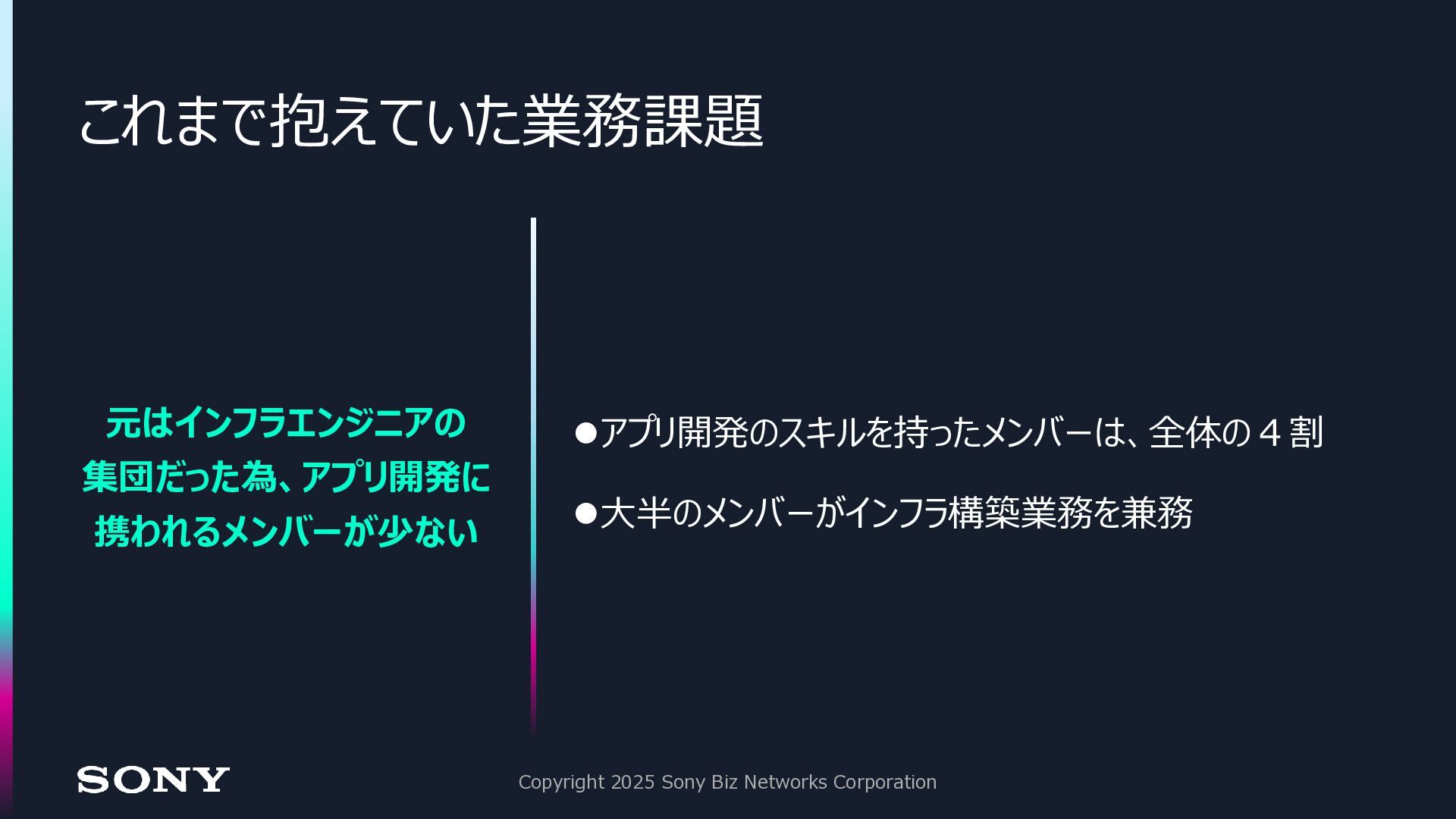13. これまで抱えていた業務課題 Copyright 2025 Sony Biz Networks Corporation 元はインフラエンジニアの 集団だった為、アプリ開発に 携われるメンバーが少ない