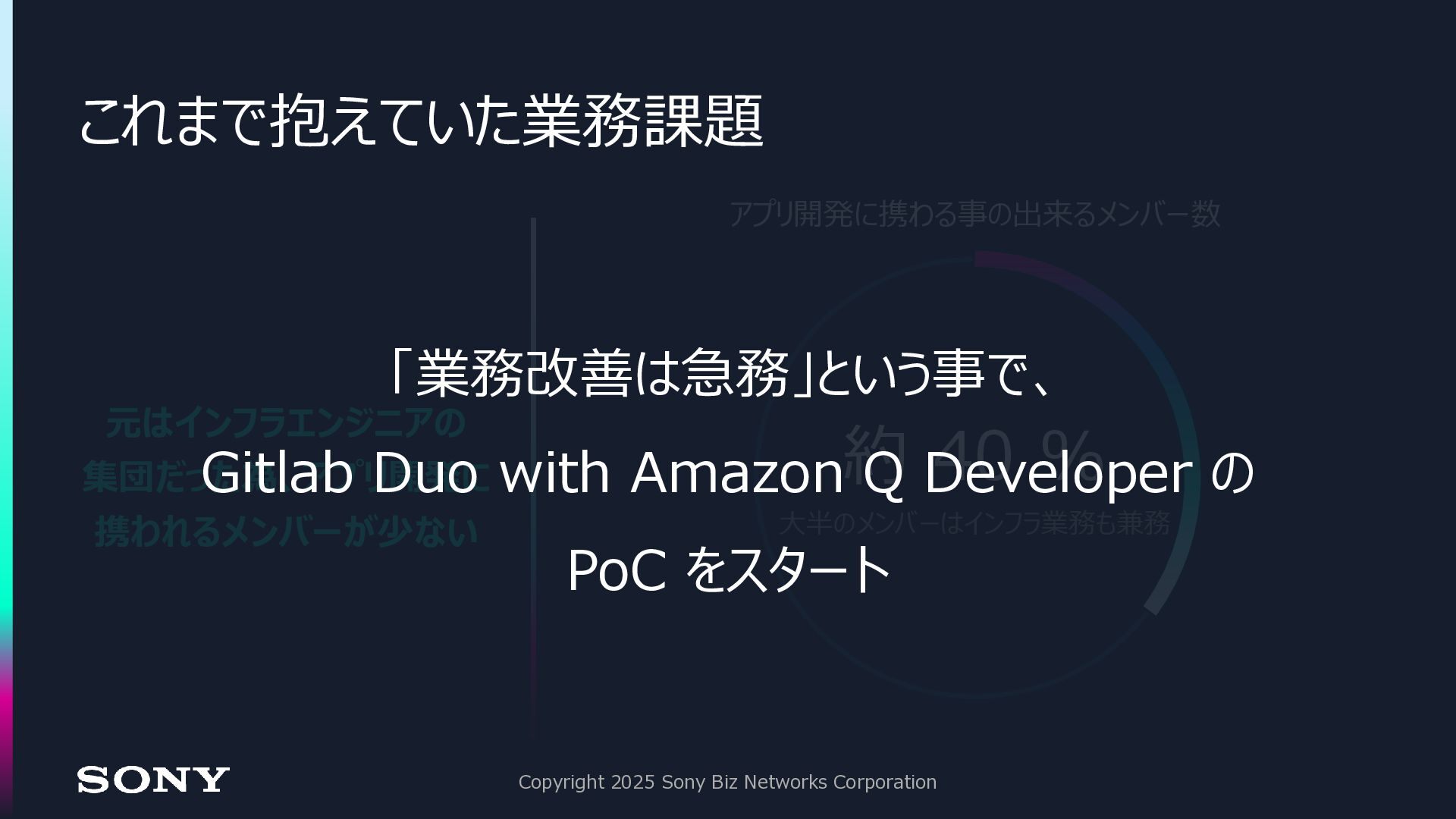 アプリ開発に携わる事の出来るメンバー数 約 40 % 大半のメンバーはインフラ業務も兼務 「業務改善は急務」という事で、 Gitlab Duo with Amazon Q Developer の PoC をスタート