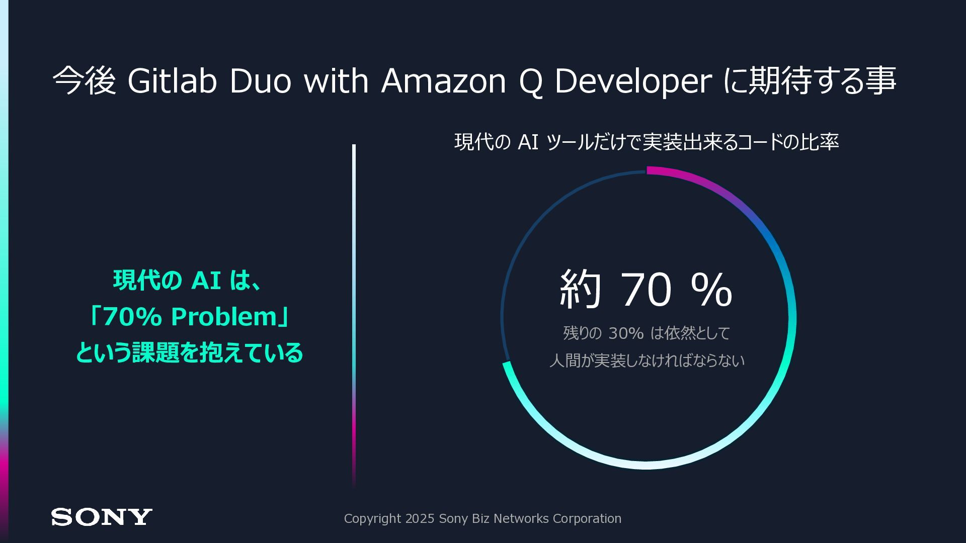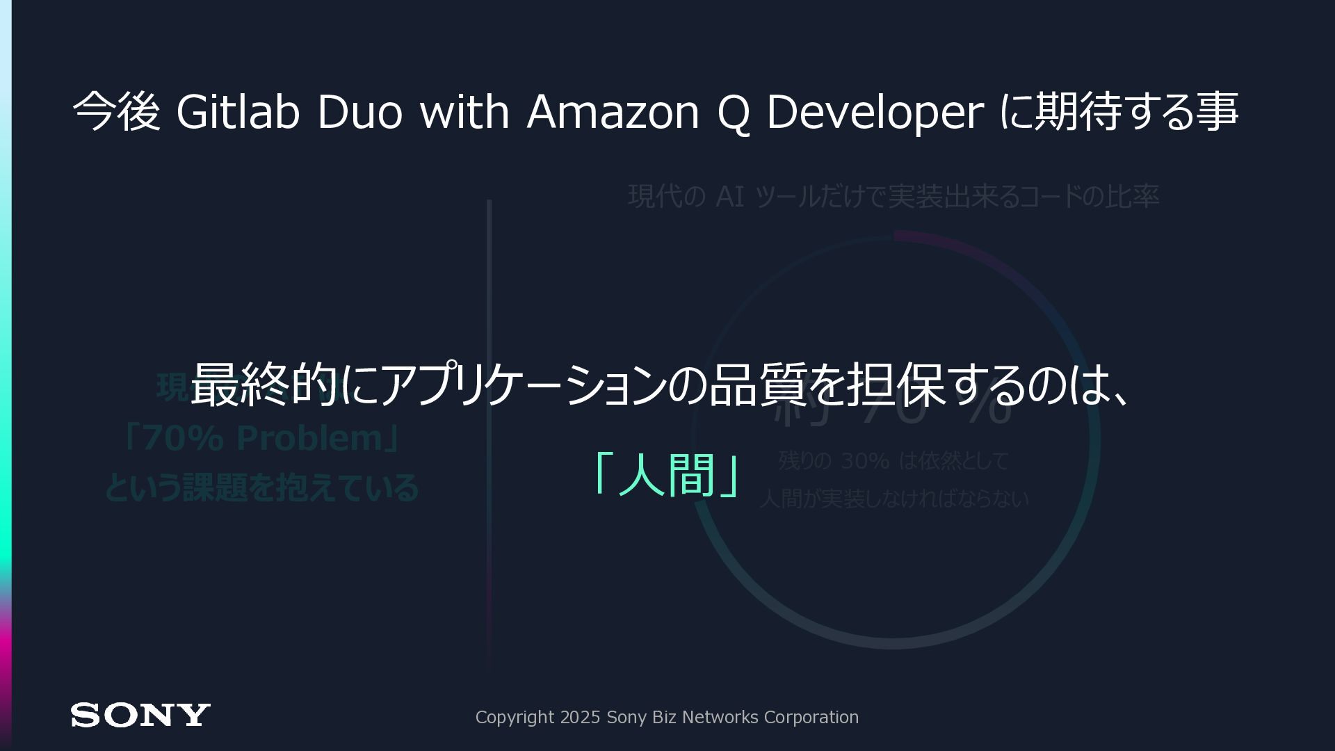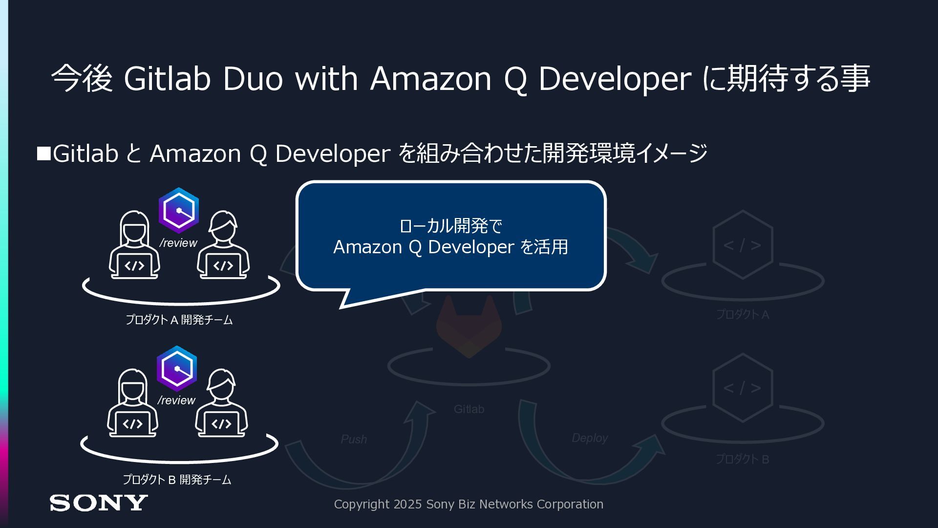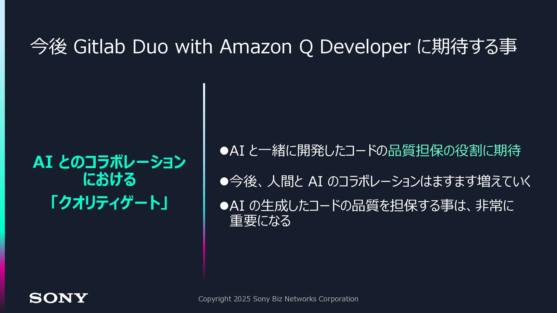 ◼今後、全ての領域において AI とのコラボレーションは増えていく ◼Gitlab Duo with Amazon Q Developer は、今後の生成 AI 活用に おける「クオリティゲート」として活躍する Copyright 2025 Sony Biz Networks Corporation