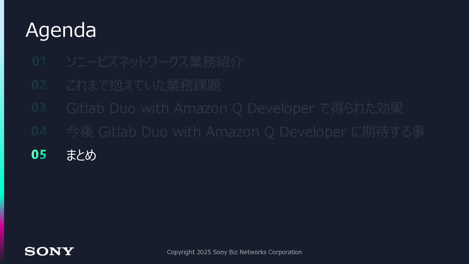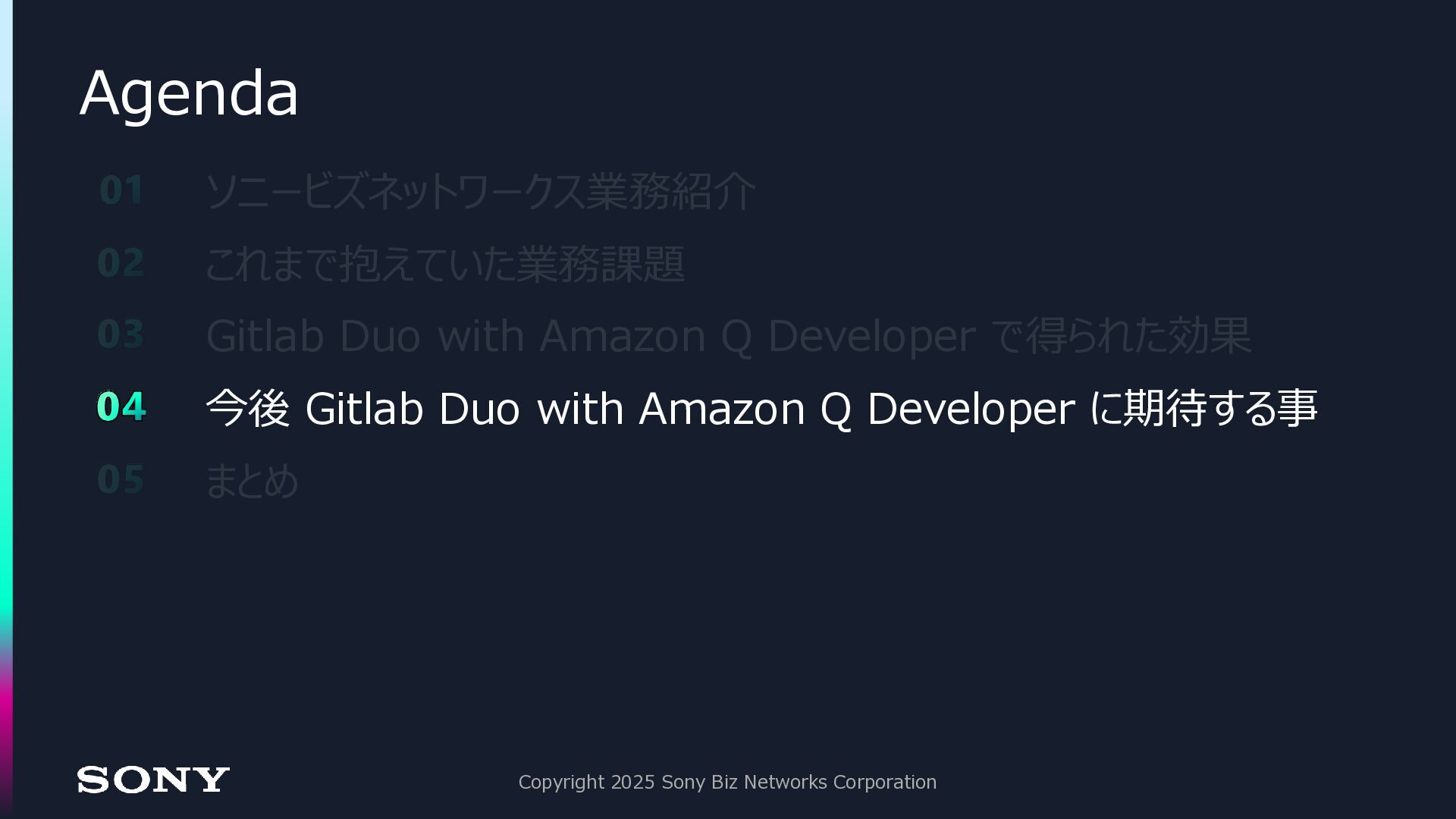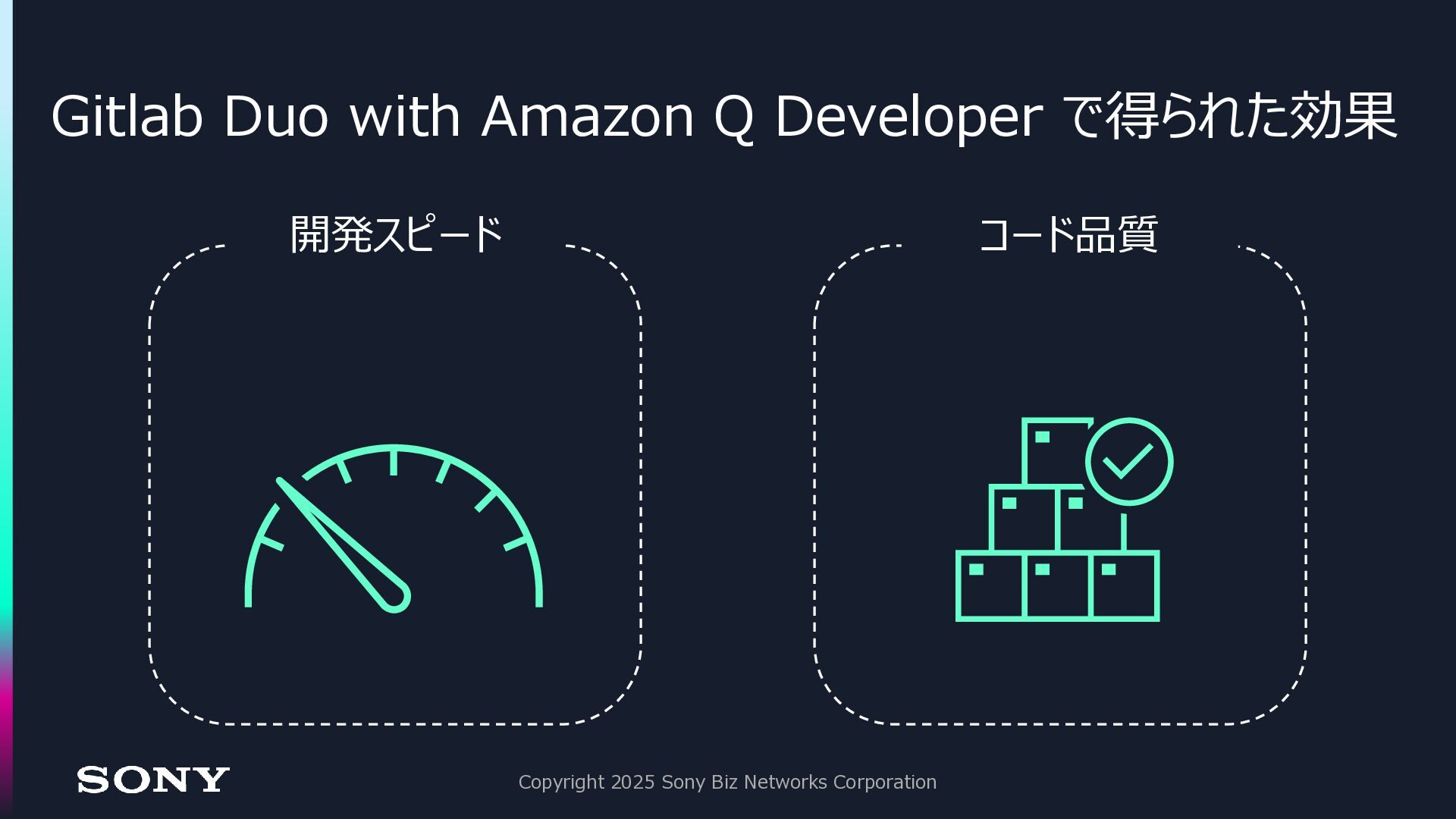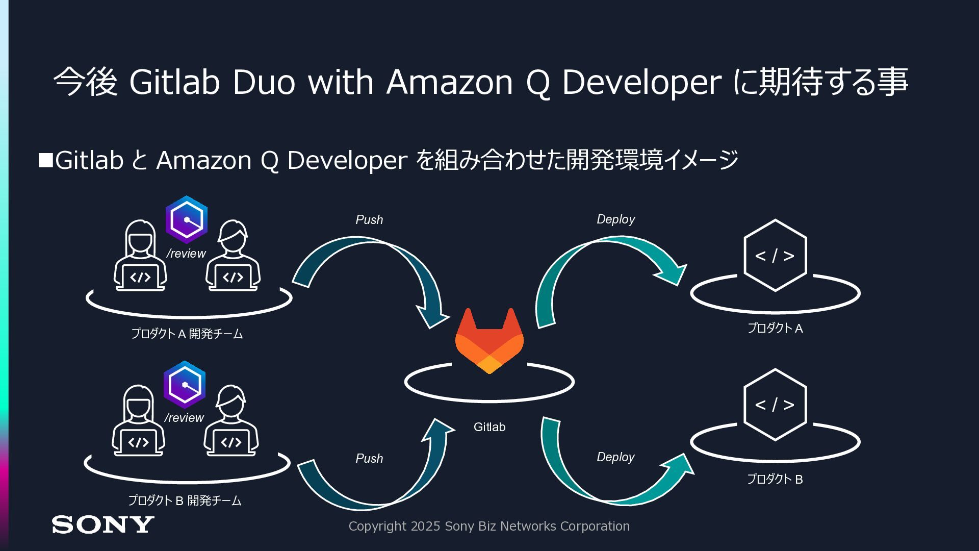 ◼今後、全ての領域において AI とのコラボレーションは増えていく ◼Gitlab Duo with Amazon Q Developer は、今後の生成 AI 活用に おける「クオリティゲート」として活躍する Copyright 2025 Sony Biz Networks Corporation