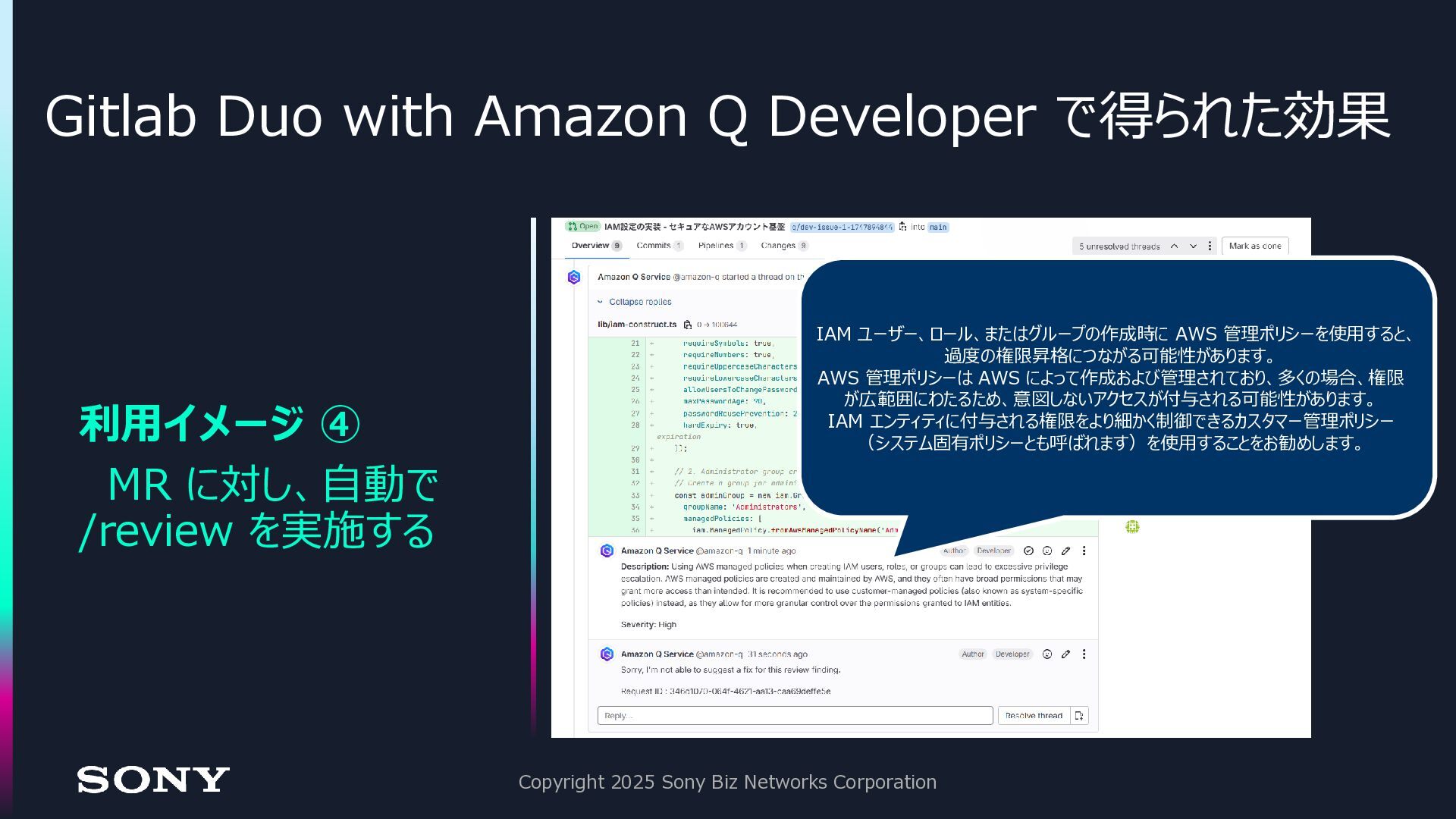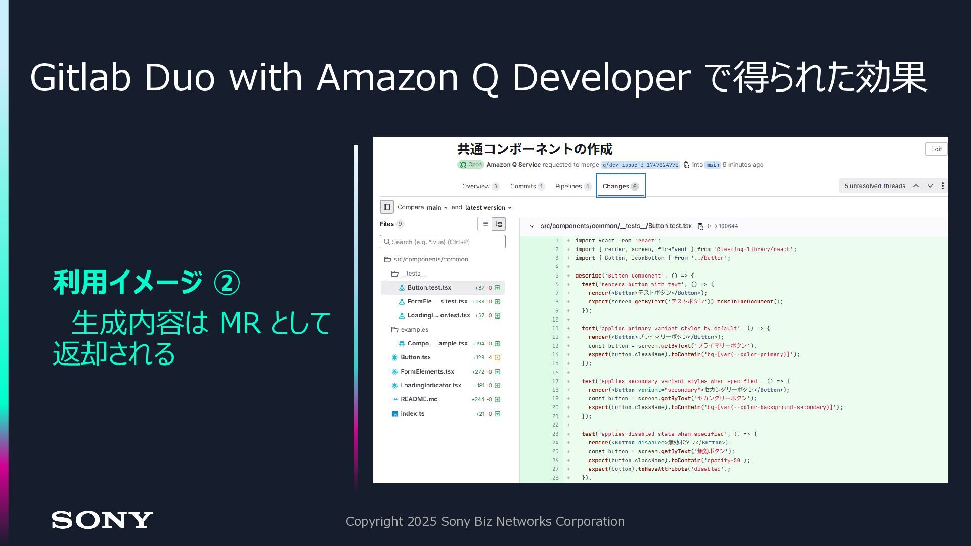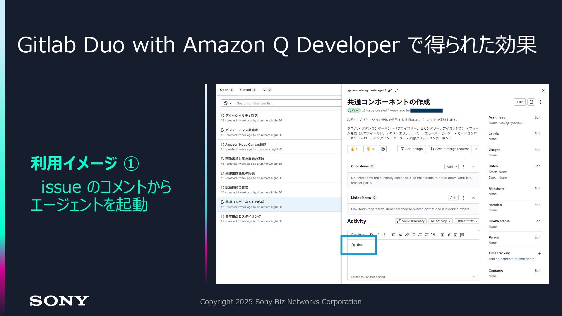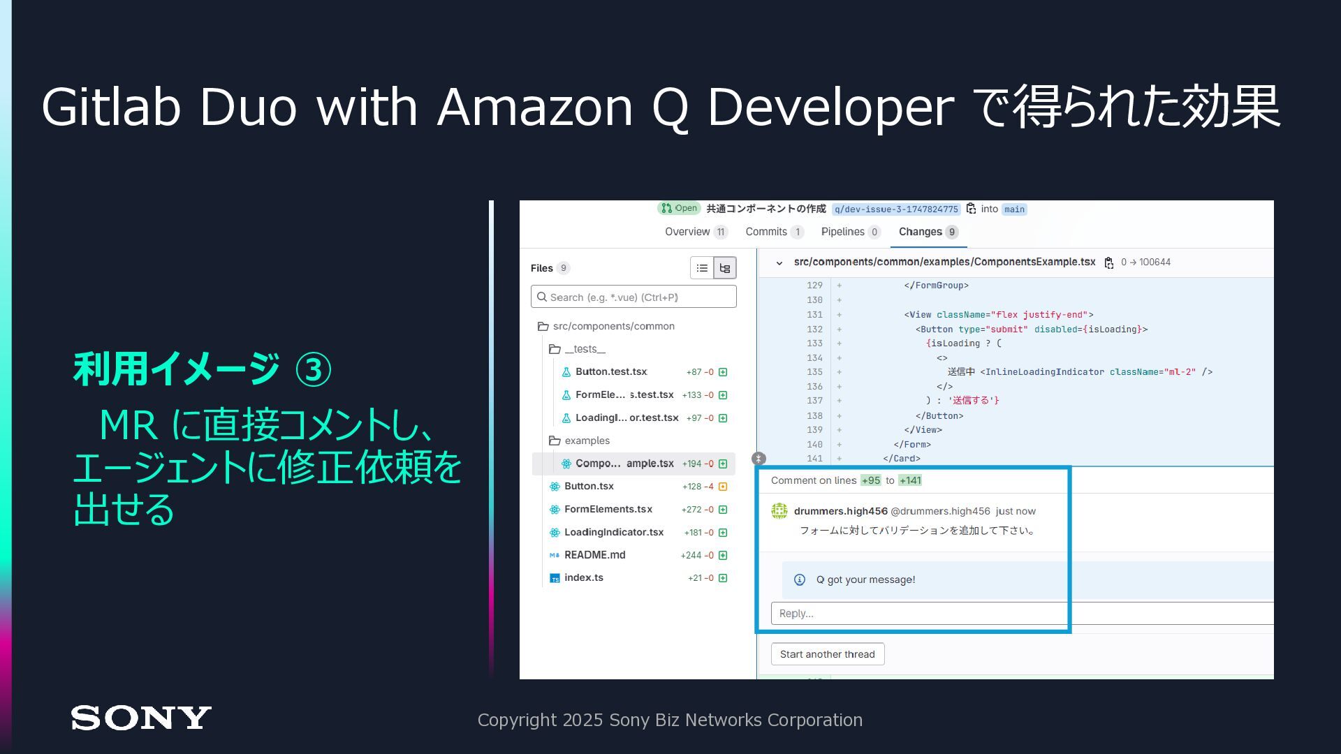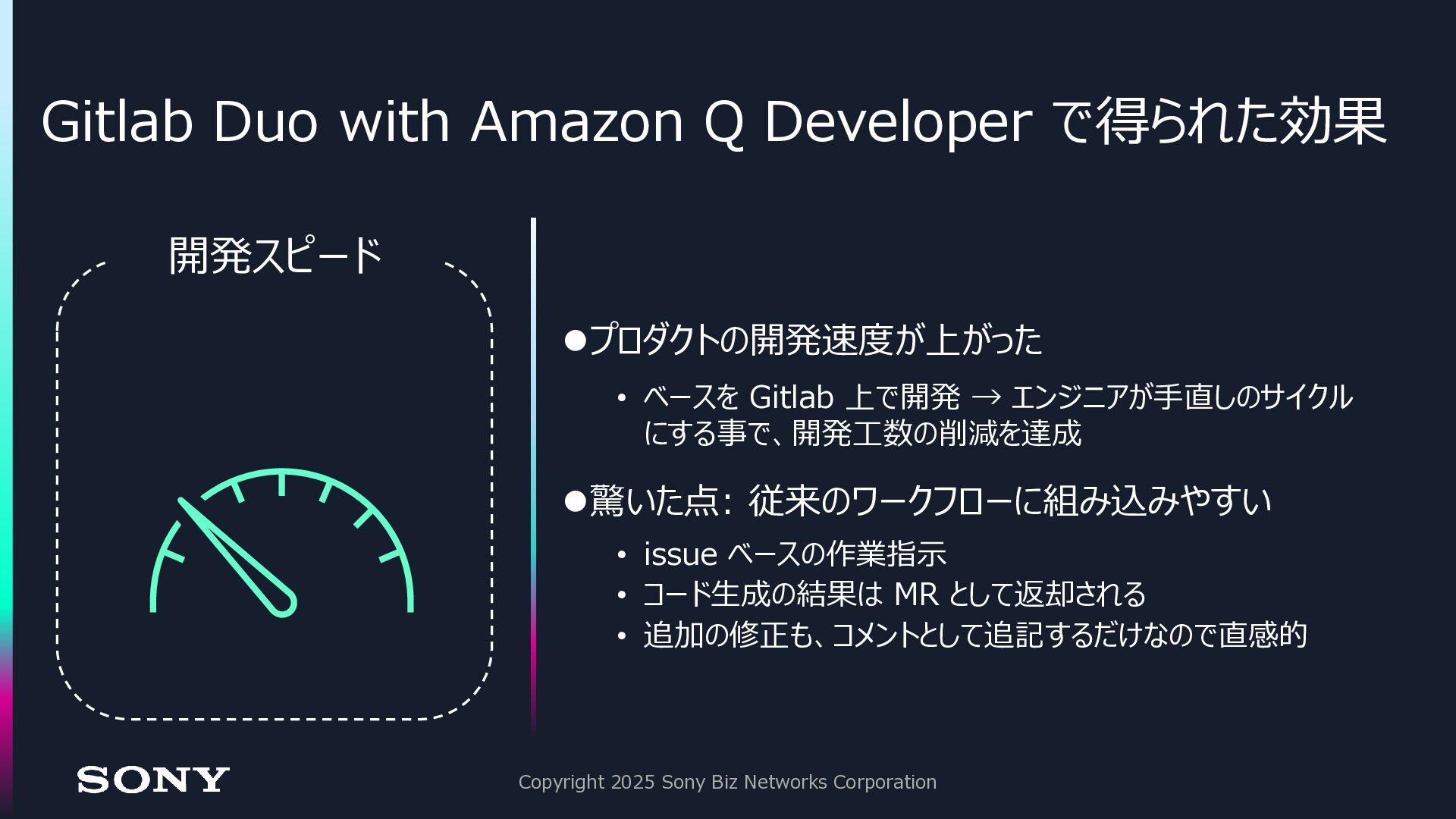 Gitlab 上で開発 → エンジニアが手直しのサイクル にする事で、開発工数の削減を達成 ⚫驚いた点: 従来のワークフローに組み込みやすい • issue ベースの作業指示 • コード生成の結果は MR として返却される • 追加の修正も、コメントとして追記するだけなので直感的 Copyright 2025 Sony Biz Networks Corporation 開発スピード
