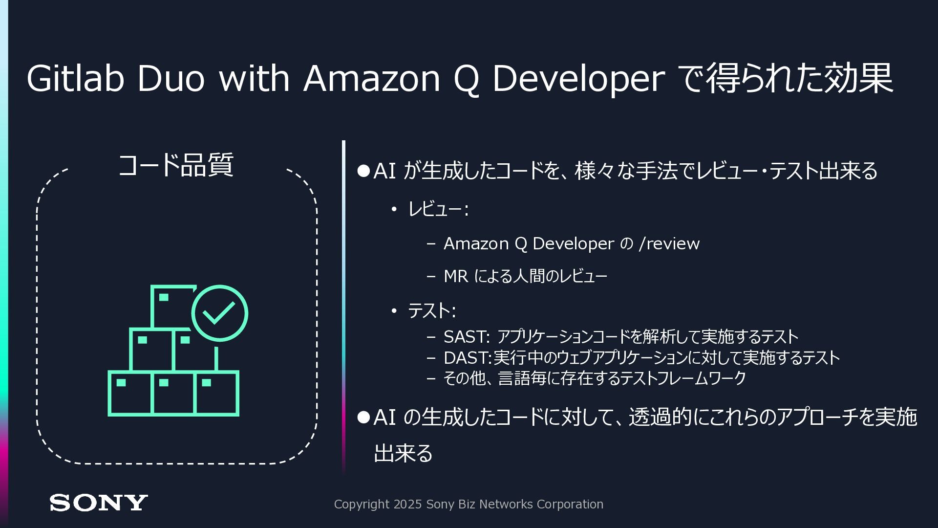 レビュー: – Amazon Q Developer の /review – MR による人間のレビュー • テスト: – SAST: アプリケーションコードを解析して実施するテスト – DAST:実行中のウェブアプリケーションに対して実施するテスト – その他、言語毎に存在するテストフレームワーク ⚫AI の生成したコードに対して、透過的にこれらのアプローチを実施 出来る Copyright 2025 Sony Biz Networks Corporation コード品質