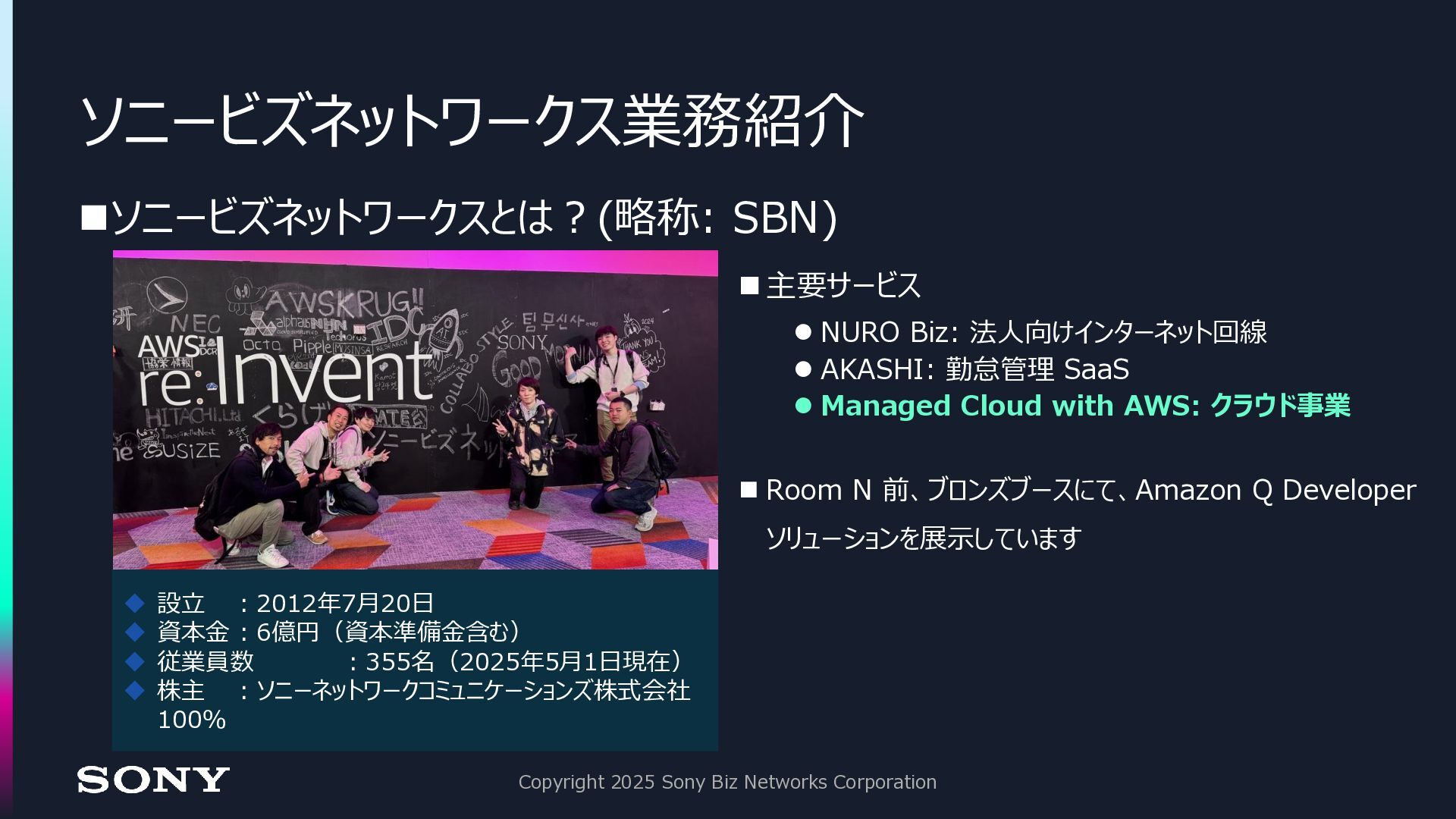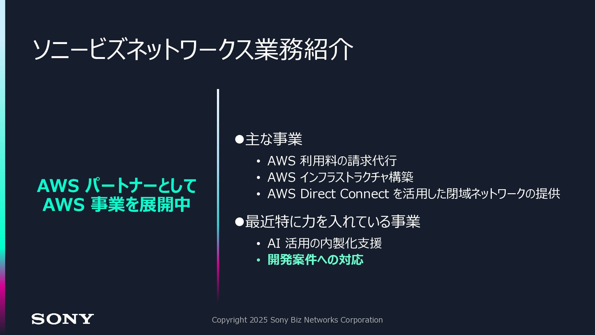 Direct Connect を活用した閉域ネットワークの提供 ⚫最近特に力を入れている事業 • AI 活用の内製化支援 • 開発案件への対応 AWS パートナーとして AWS 事業を展開中 Copyright 2025 Sony Biz Networks Corporation