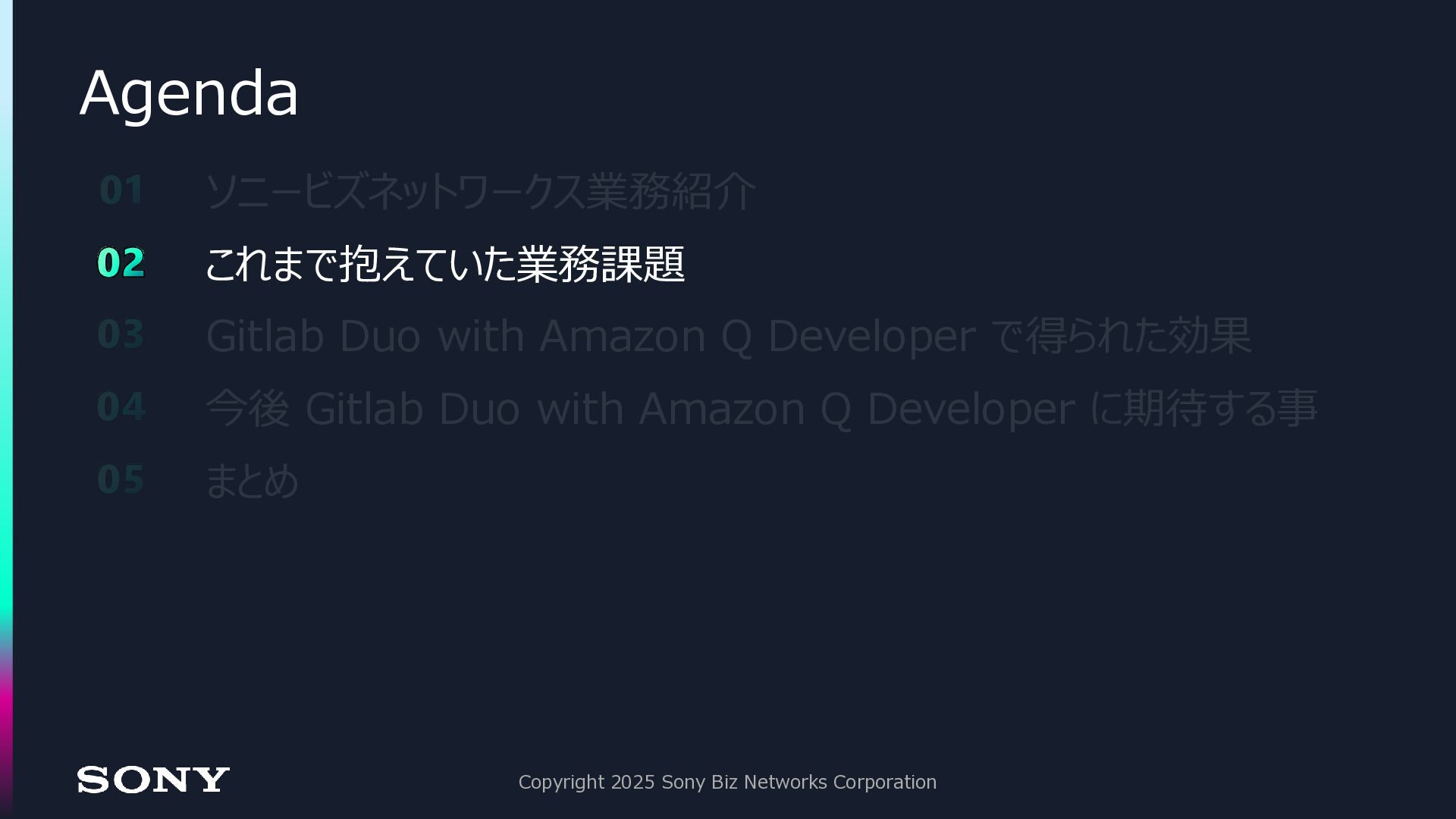 2. Agenda Copyright 2025 Sony Biz Networks Corporation 01 ソニービズネットワークス業務紹介 02