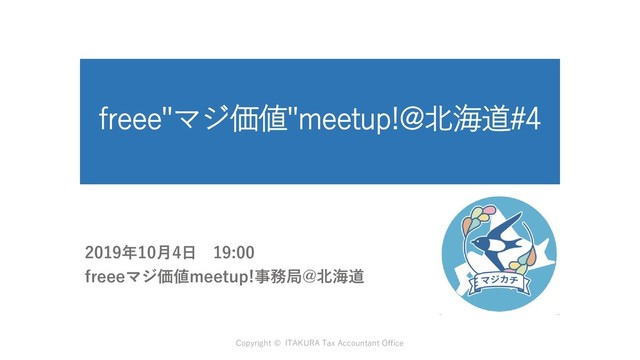 freee"マジ価値"meetup!@北海道#4 2019年10月4日 19:00 freeeマジ価値meetup!事務局@北海道 Copyright © ITAKURA Tax Accountant Office