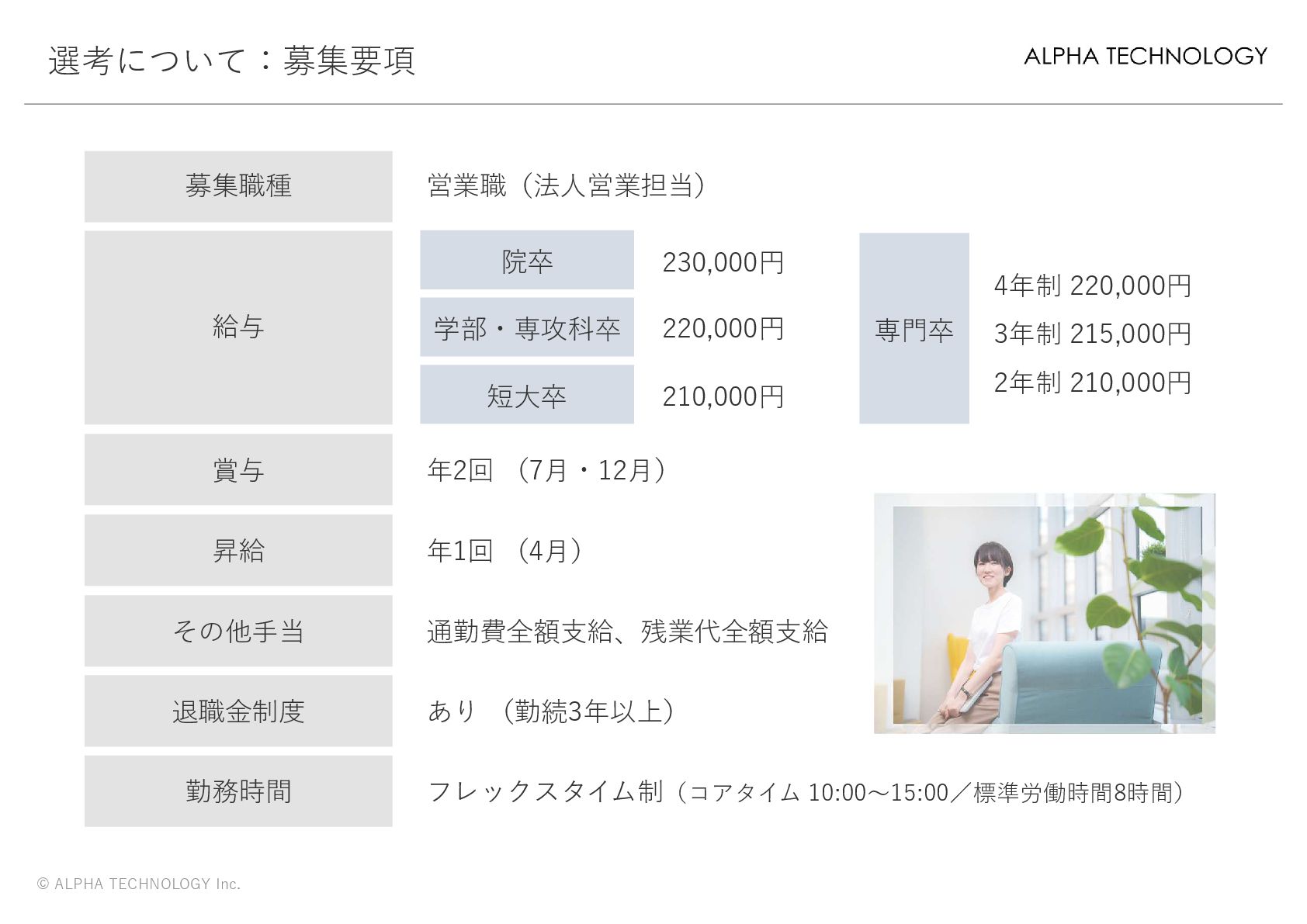 選考について:募集要項 © ALPHA TECHNOLOGY Inc. 募集職種 営業職(法人営業担当) 給与 賞与 年2回