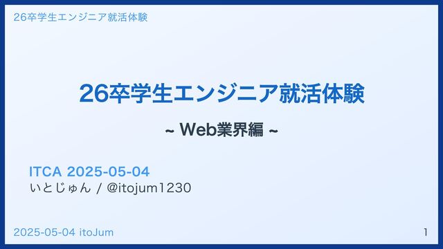 26卒学生エンジニア就活体験 ~ Web業界編 ~ ITCA 2025-05-04 いとじゅん / @itojum1230 26卒学生エンジニア就活体験