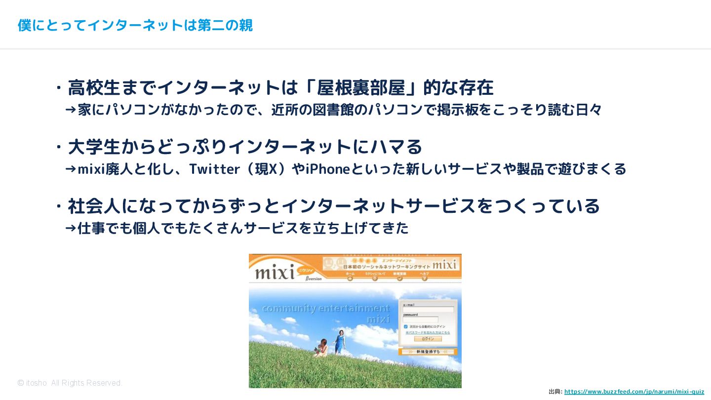 © itosho All Rights Reserved. 僕にとってインターネットは第二の親 ・高校生までインターネットは「屋根裏部屋」的な存在 →家にパソコンがなかったので、近所の図書館のパソコンで掲示板をこっそり読む日々 ・大学生からどっぷりインターネットにハマる →mixi廃人と化し、Twitter(現X)やiPhoneといった新しいサービスや製品で遊びまくる