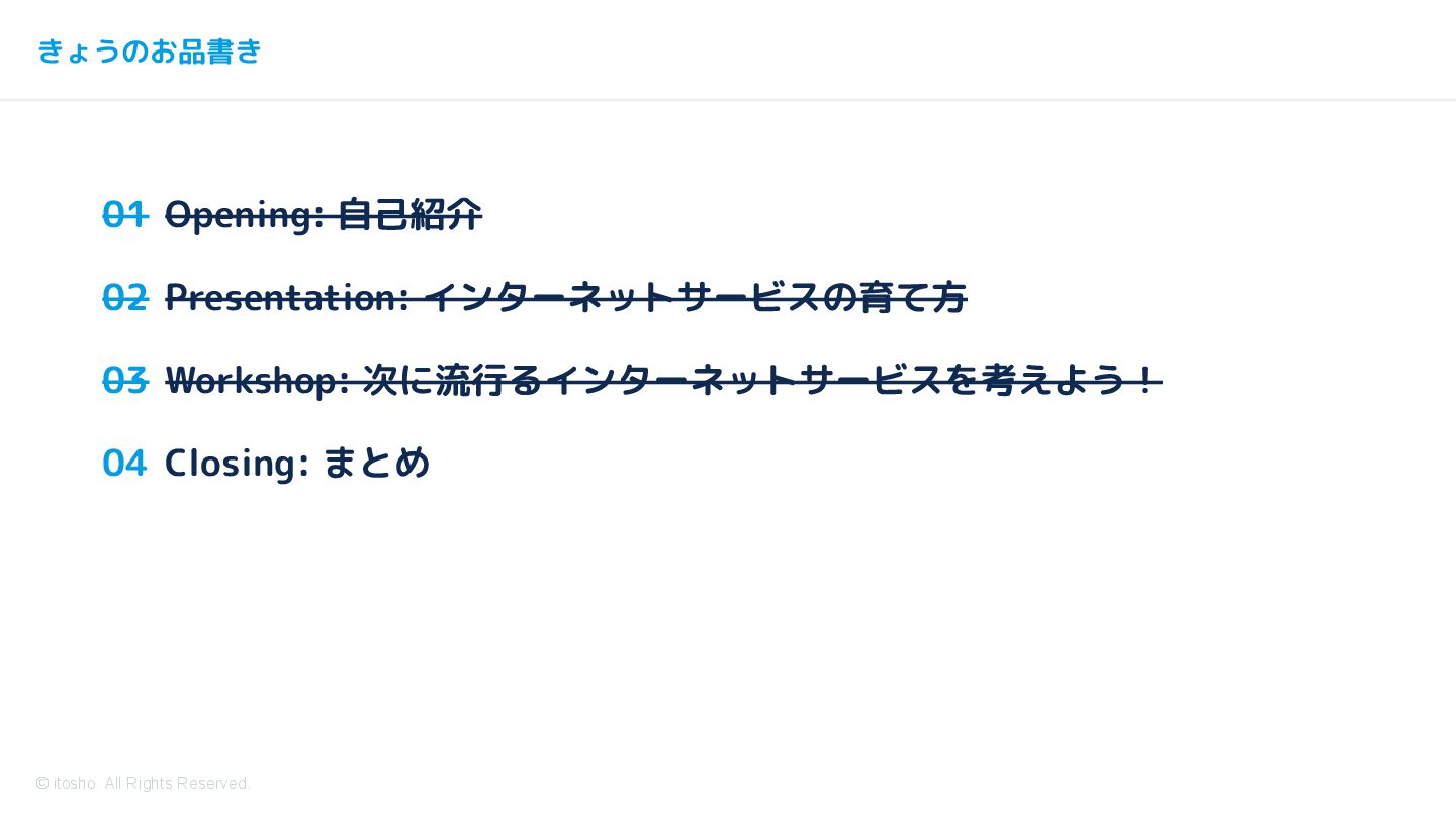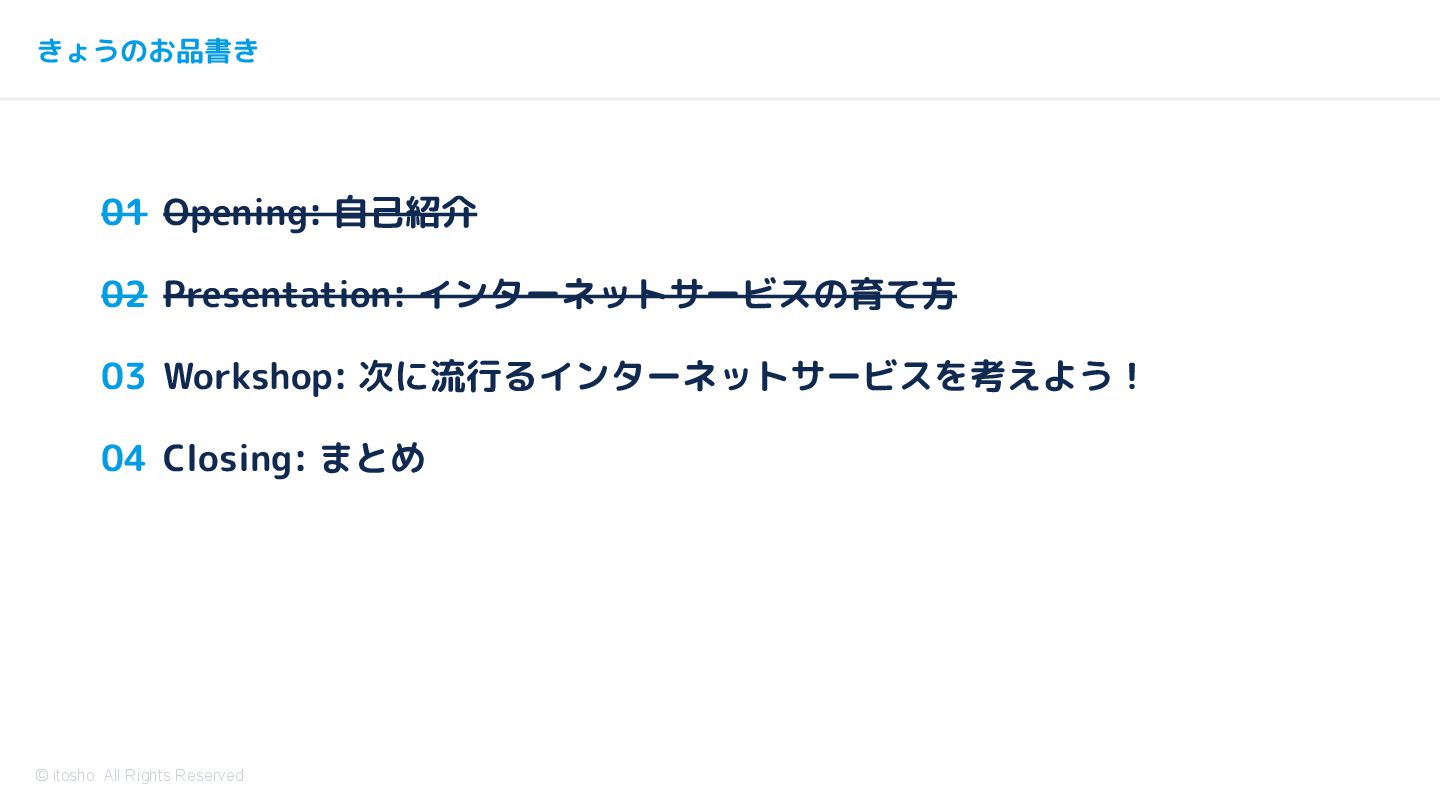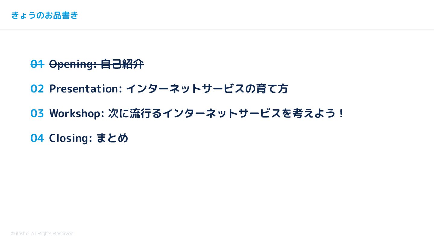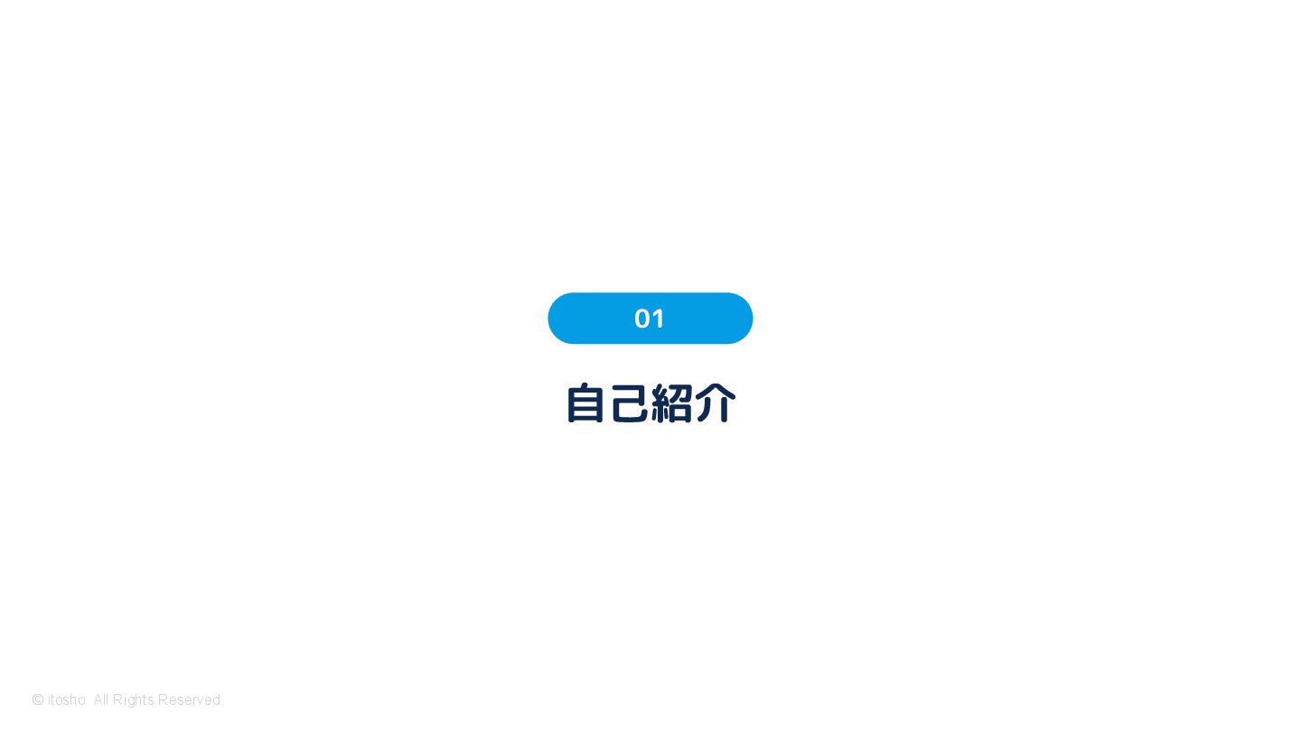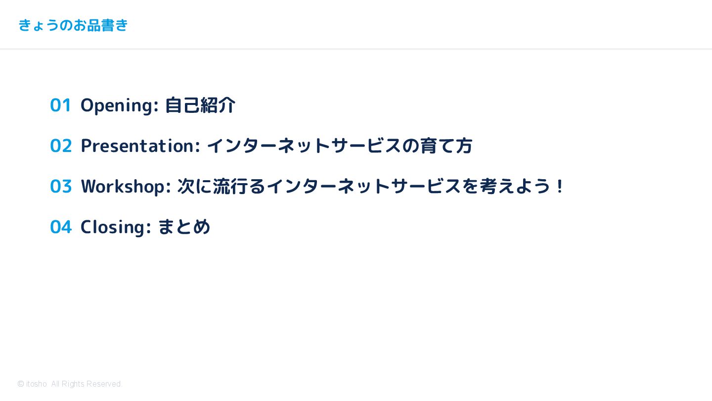 © itosho All Rights Reserved. きょうのお品書き Opening: 自己紹介 01 Presentation: