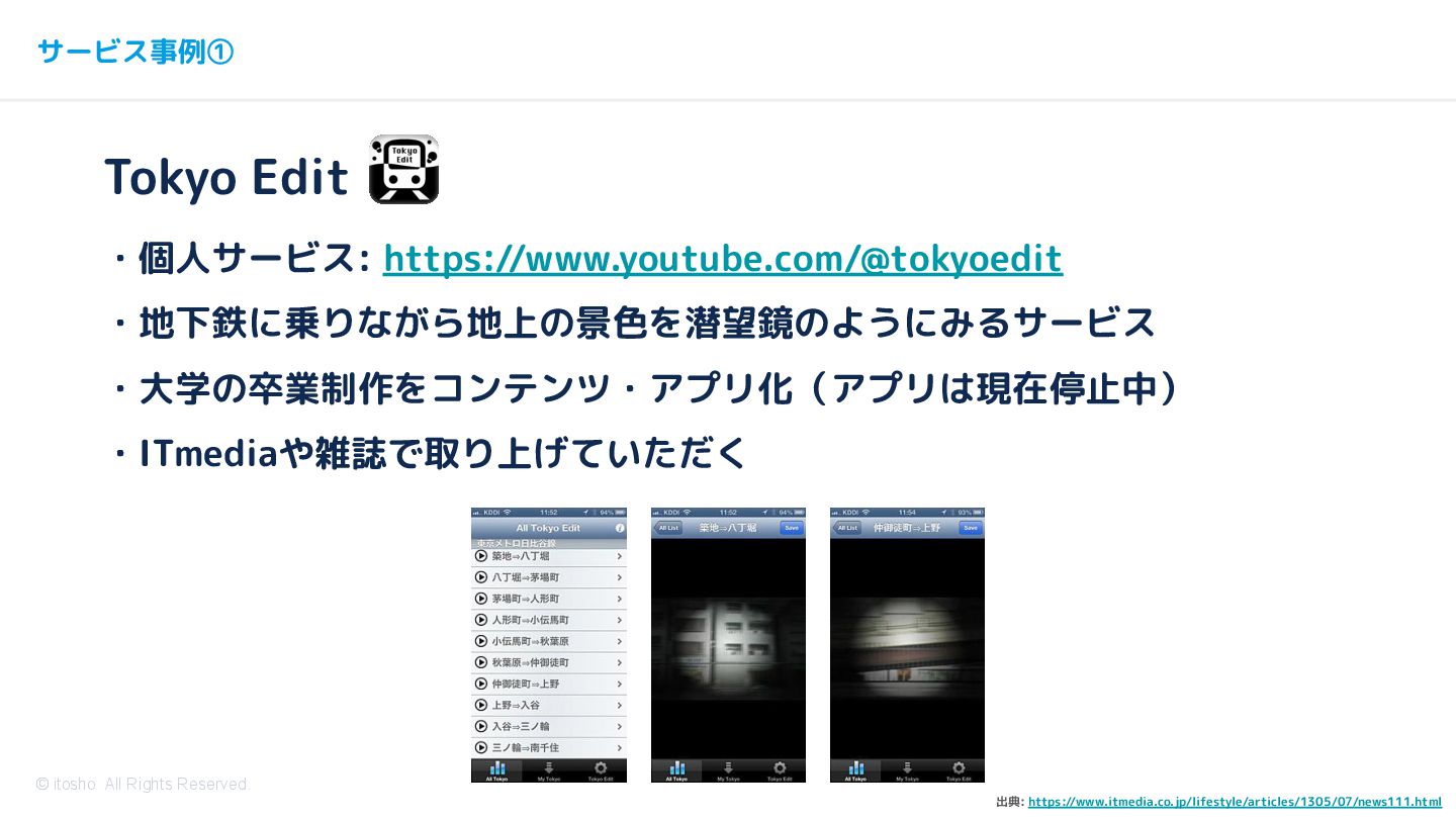 © itosho All Rights Reserved. サービス事例① Tokyo Edit ・個人サービス: https://www.youtube.com/@tokyoedit
