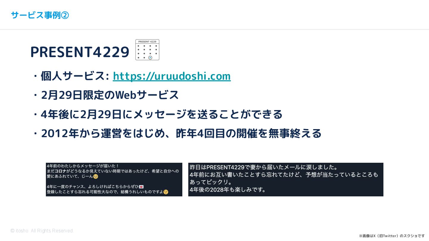 © itosho All Rights Reserved. サービス事例② PRESENT4229 ・個人サービス: https://uruudoshi.com ・2月29日限定のWebサービス