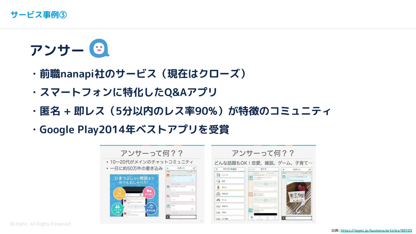 © itosho All Rights Reserved. サービス事例③ アンサー ・前職nanapi社のサービス(現在はクローズ) ・スマートフォンに特化したQ&Aアプリ ・匿名