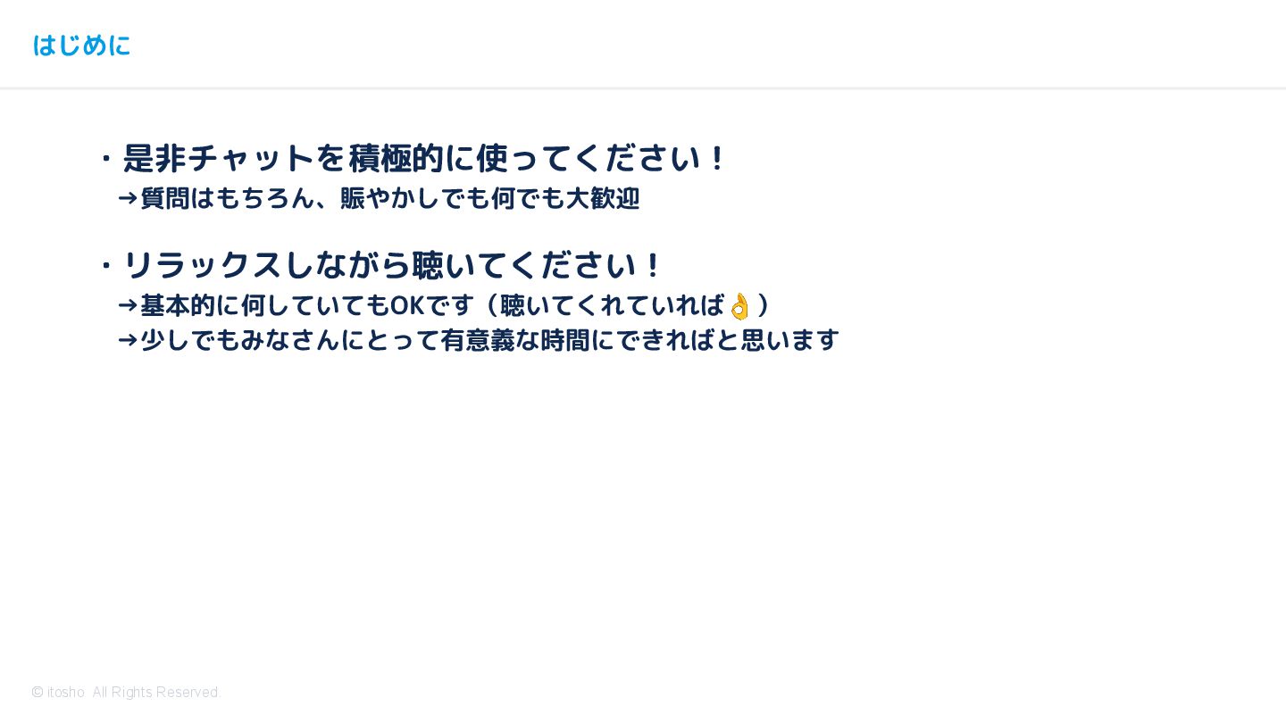 © itosho All Rights Reserved. はじめに ・是非チャットを積極的に使ってください! →質問はもちろん、賑やかしでも何でも大歓迎 ・リラックスしながら聴いてください! →基本的に何していてもOKです(聴いてくれていれば👌)