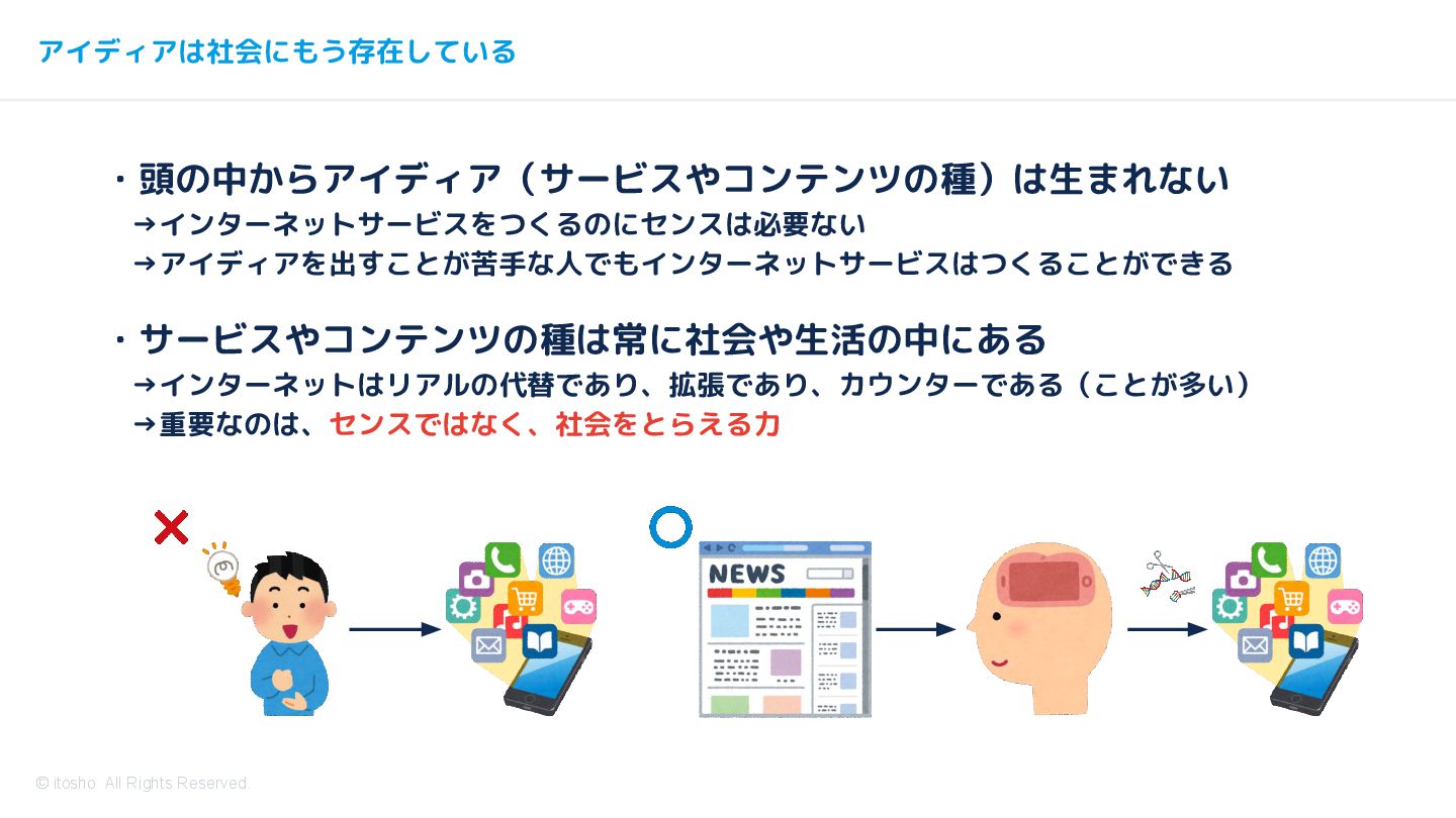 © itosho All Rights Reserved. アイディアは社会にもう存在している ・頭の中からアイディア(サービスやコンテンツの種)は生まれない →インターネットサービスをつくるのにセンスは必要ない →アイディアを出すことが苦手な人でもインターネットサービスはつくることができる ・サービスやコンテンツの種は常に社会や生活の中にある