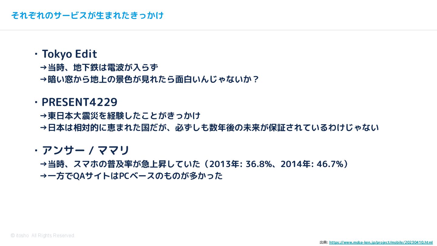 ・PRESENT4229 →東日本大震災を経験したことがきっかけ →日本は相対的に恵まれた国だが、必ずしも数年後の未来が保証されているわけじゃない ・アンサー / ママリ →当時、スマホの普及率が急上昇していた(2013年: 36.8%、2014年: 46.7%) →一方でQAサイトはPCベースのものが多かった 出典: https://www.moba-ken.jp/project/mobile/20230410.html