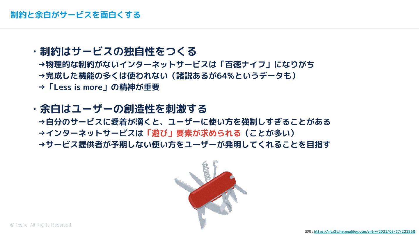 © itosho All Rights Reserved. 制約と余白がサービスを面白くする ・制約はサービスの独自性をつくる →物理的な制約がないインターネットサービスは「百徳ナイフ」になりがち →完成した機能の多くは使われない(諸説あるが64%というデータも) →「Less