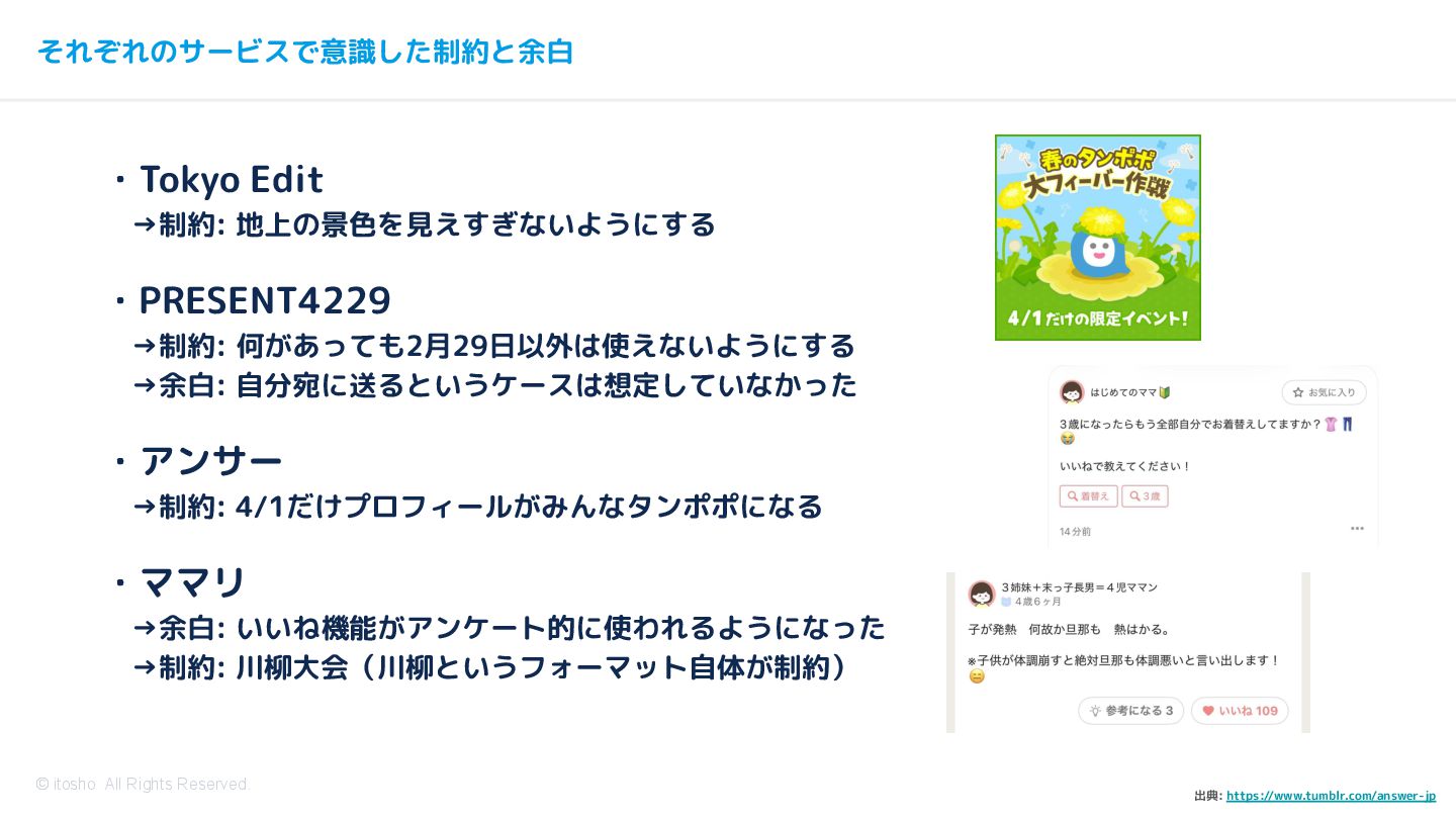 ・PRESENT4229 →制約: 何があっても2月29日以外は使えないようにする →余白: 自分宛に送るというケースは想定していなかった ・アンサー →制約: 4/1だけプロフィールがみんなタンポポになる ・ママリ →余白: いいね機能がアンケート的に使われるようになった →制約: 川柳大会(川柳というフォーマット自体が制約) 出典: https://www.tumblr.com/answer-jp