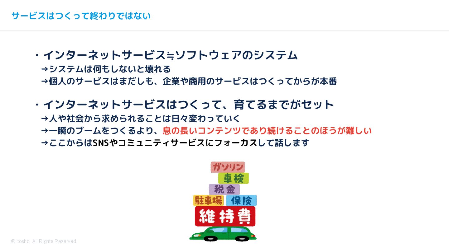 © itosho All Rights Reserved. サービスはつくって終わりではない ・インターネットサービス≒ソフトウェアのシステム →システムは何もしないと壊れる →個人のサービスはまだしも、企業や商用のサービスはつくってからが本番 ・インターネットサービスはつくって、育てるまでがセット