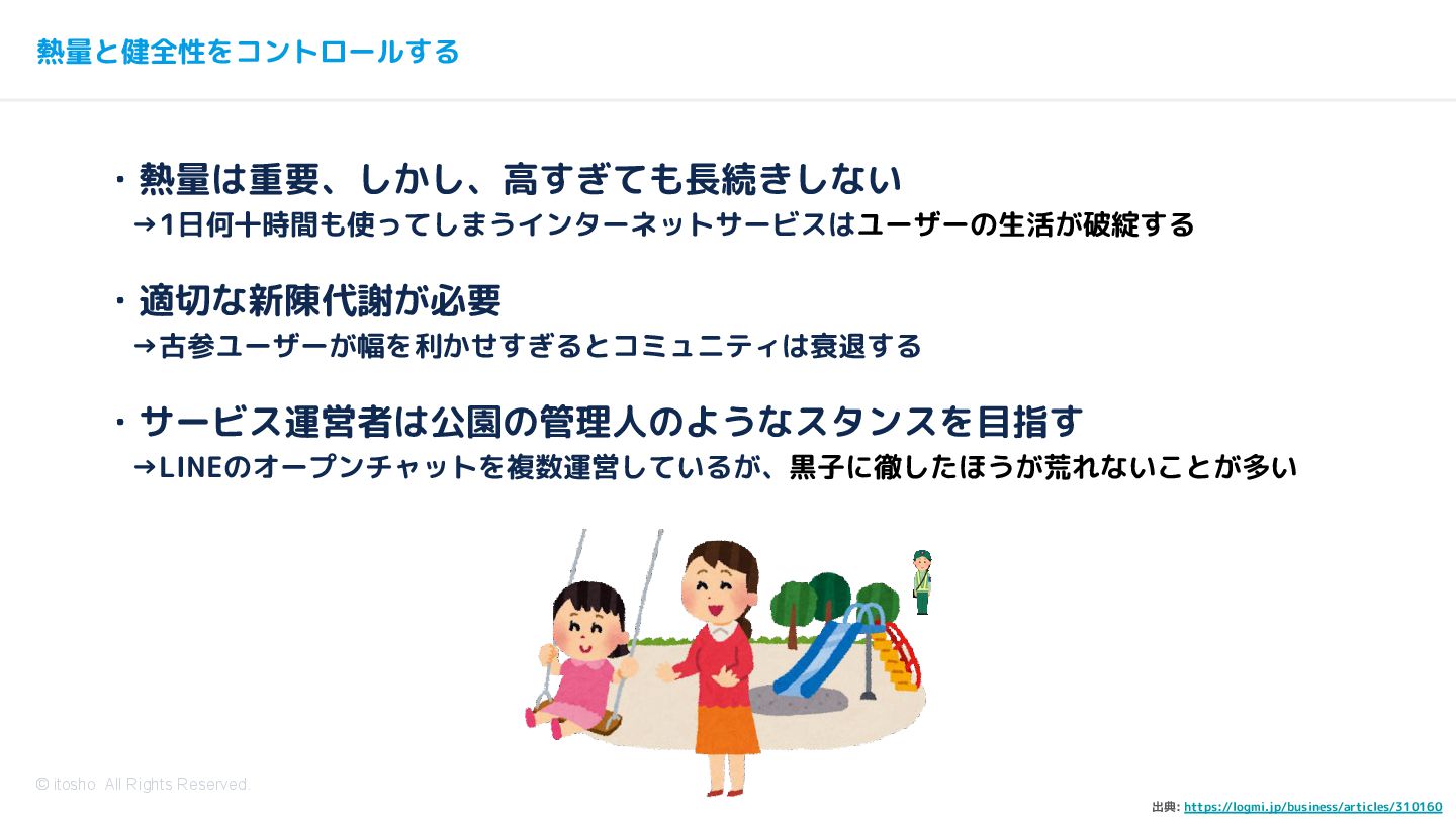 © itosho All Rights Reserved. 熱量と健全性をコントロールする ・熱量は重要、しかし、高すぎても長続きしない →1日何十時間も使ってしまうインターネットサービスはユーザーの生活が破綻する ・適切な新陳代謝が必要 →古参ユーザーが幅を利かせすぎるとコミュニティは衰退する