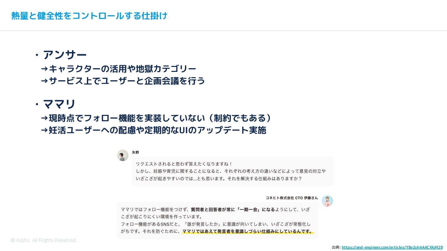 © itosho All Rights Reserved. 熱量と健全性をコントロールする仕掛け ・アンサー →キャラクターの活用や地獄カテゴリー →サービス上でユーザーと企画会議を行う ・ママリ