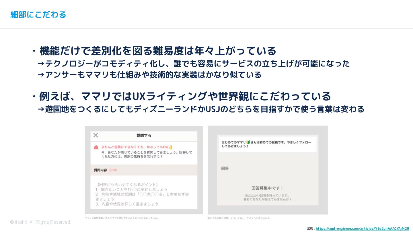 © itosho All Rights Reserved. 細部にこだわる ・機能だけで差別化を図る難易度は年々上がっている →テクノロジーがコモディティ化し、誰でも容易にサービスの立ち上げが可能になった →アンサーもママリも仕組みや技術的な実装はかなり似ている ・例えば、ママリではUXライティングや世界観にこだわっている