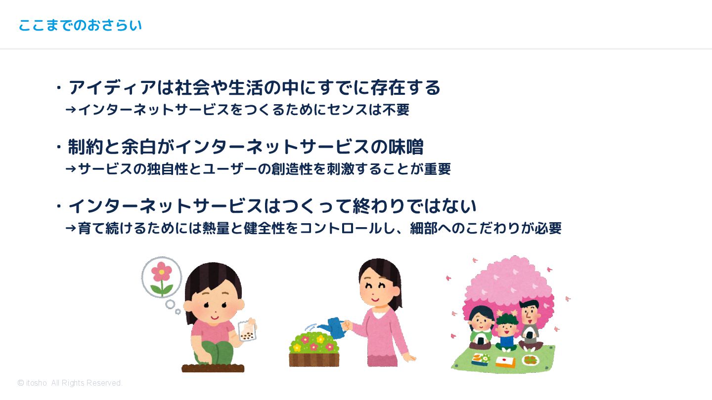 © itosho All Rights Reserved. ここまでのおさらい ・アイディアは社会や生活の中にすでに存在する →インターネットサービスをつくるためにセンスは不要 ・制約と余白がインターネットサービスの味噌 →サービスの独自性とユーザーの創造性を刺激することが重要