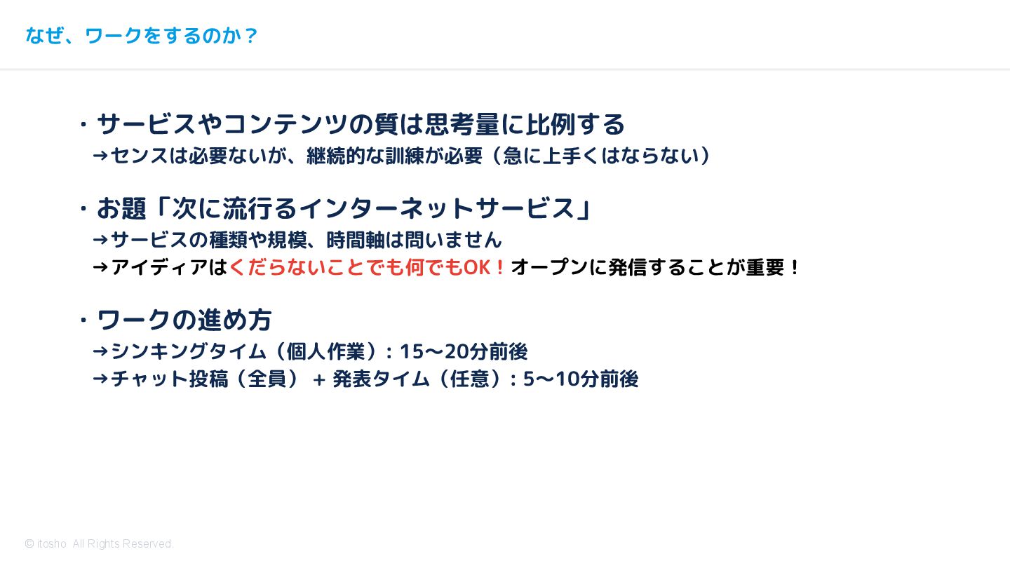 © itosho All Rights Reserved. なぜ、ワークをするのか? ・サービスやコンテンツの質は思考量に比例する →センスは必要ないが、継続的な訓練が必要(急に上手くはならない) ・お題「次に流行るインターネットサービス」 →サービスの種類や規模、時間軸は問いません