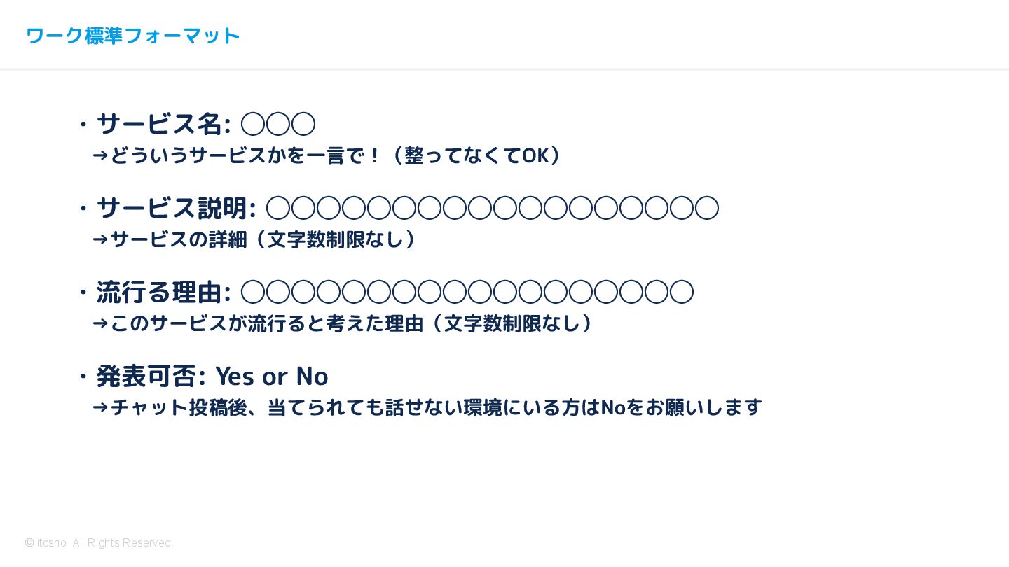 © itosho All Rights Reserved. ワーク標準フォーマット ・サービス名: ◯◯◯ →どういうサービスかを一言で!(整ってなくてOK) ・サービス説明: