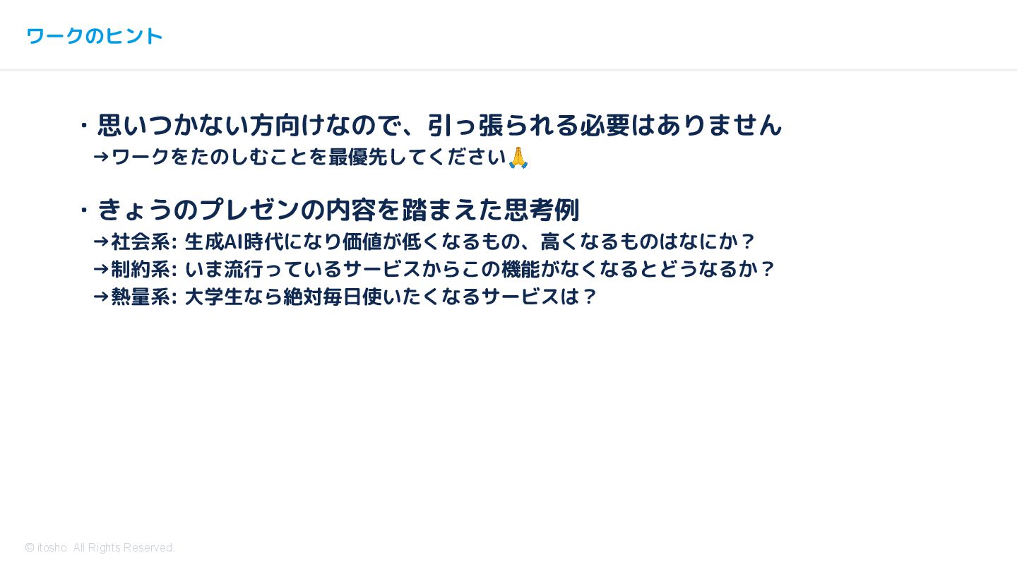 © itosho All Rights Reserved. ワークのヒント ・思いつかない方向けなので、引っ張られる必要はありません →ワークをたのしむことを最優先してください🙏 ・きょうのプレゼンの内容を踏まえた思考例 →社会系:
