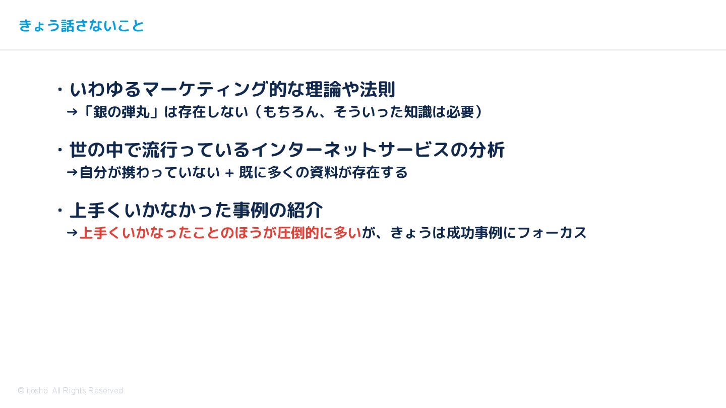 © itosho All Rights Reserved. きょう話さないこと ・いわゆるマーケティング的な理論や法則 →「銀の弾丸」は存在しない(もちろん、そういった知識は必要) ・世の中で流行っているインターネットサービスの分析 →自分が携わっていない