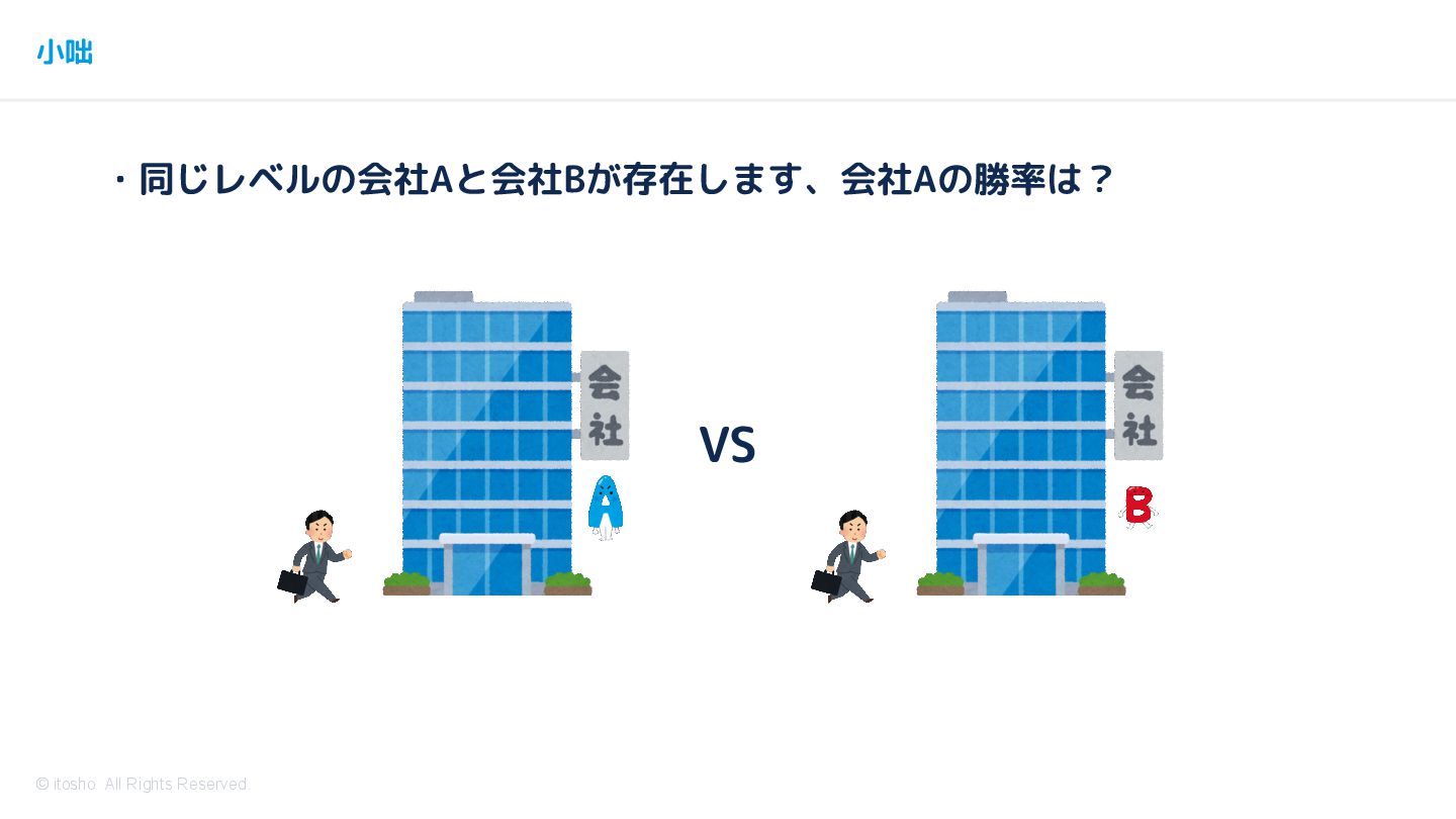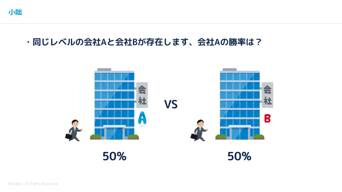 © itosho All Rights Reserved. ・同じレベルの会社Aと会社Bが存在します、会社Aの勝率は? 小咄 VS 50% 50%