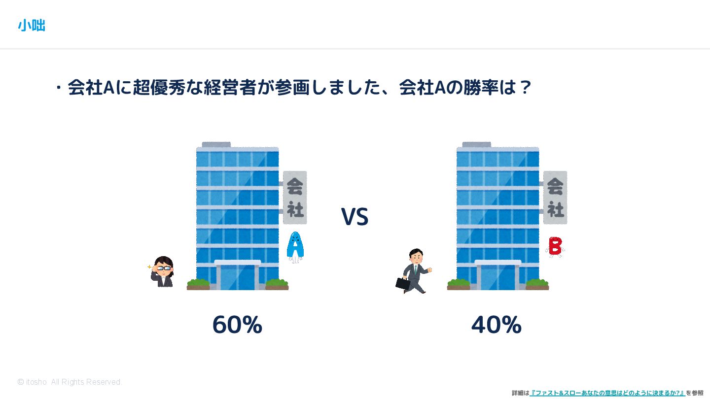 © itosho All Rights Reserved. ・会社Aに超優秀な経営者が参画しました、会社Aの勝率は? 小咄 VS 60% 40%