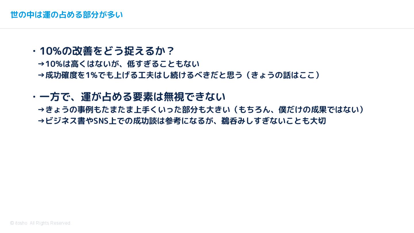 © itosho All Rights Reserved. 世の中は運の占める部分が多い ・10%の改善をどう捉えるか? →10%は高くはないが、低すぎることもない →成功確度を1%でも上げる工夫はし続けるべきだと思う(きょうの話はここ) ・一方で、運が占める要素は無視できない