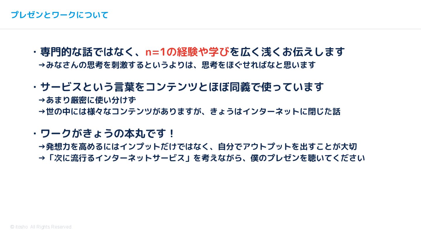 © itosho All Rights Reserved. プレゼンとワークについて ・専門的な話ではなく、n=1の経験や学びを広く浅くお伝えします →みなさんの思考を刺激するというよりは、思考をほぐせればなと思います ・サービスという言葉をコンテンツとほぼ同義で使っています →あまり厳密に使い分けず、両方の言葉を使います