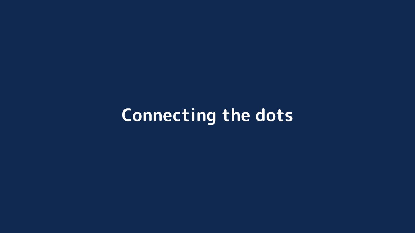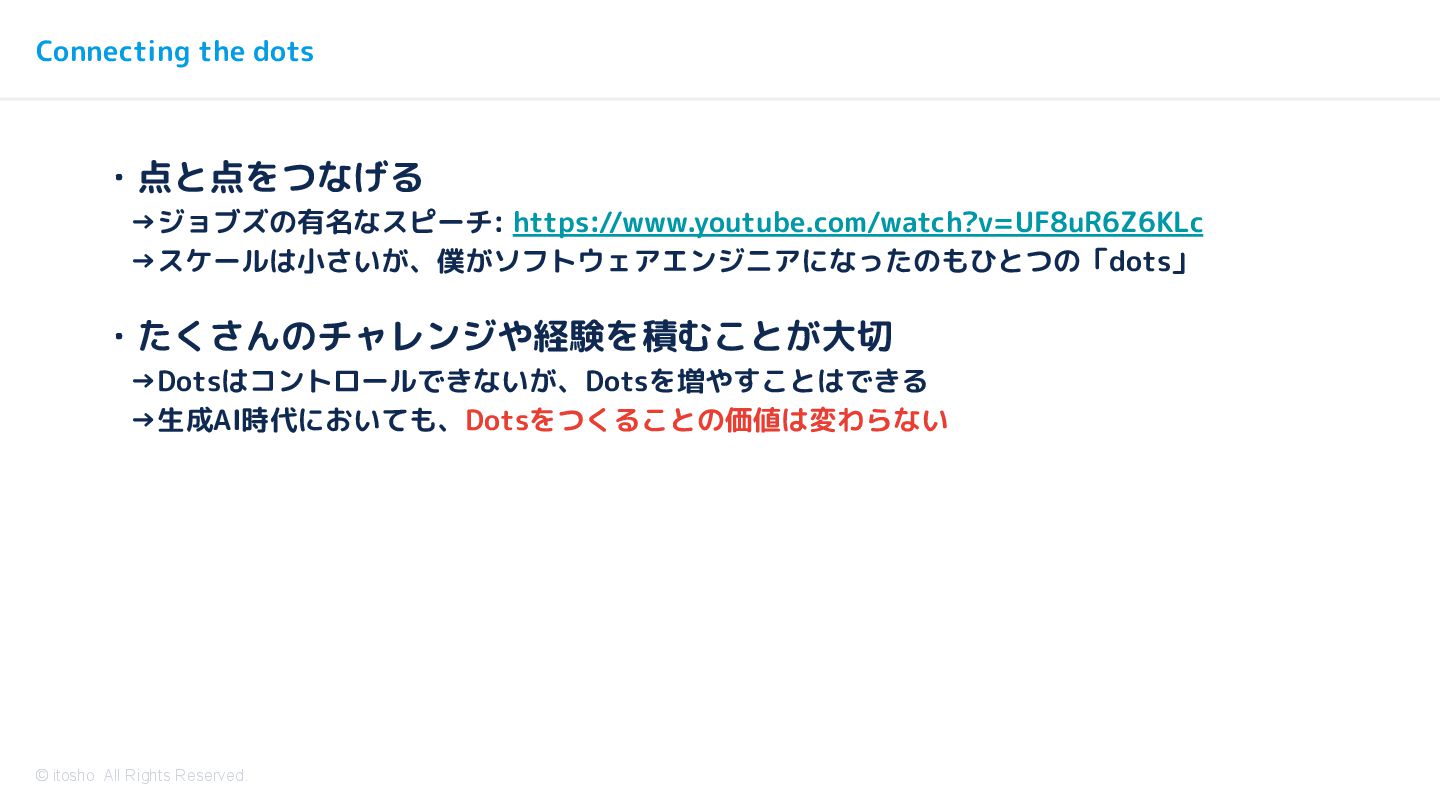 https://www.youtube.com/watch?v=UF8uR6Z6KLc →スケールは小さいが、僕がソフトウェアエンジニアになったのもひとつの「dots」 ・たくさんのチャレンジや経験を積むことが大切 →Dotsはコントロールできないが、Dotsを増やすことはできる →生成AI時代においても、Dotsをつくることの価値は変わらない