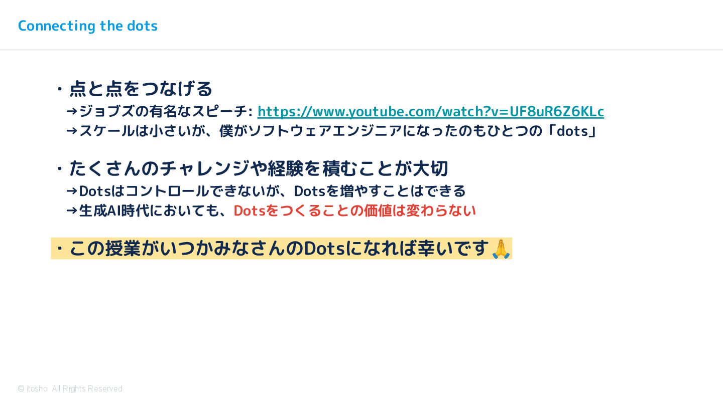 https://www.youtube.com/watch?v=UF8uR6Z6KLc →スケールは小さいが、僕がソフトウェアエンジニアになったのもひとつの「dots」 ・たくさんのチャレンジや経験を積むことが大切 →Dotsはコントロールできないが、Dotsを増やすことはできる →生成AI時代においても、Dotsをつくることの価値は変わらない ・この授業がいつかみなさんのDotsになれば幸いです🙏