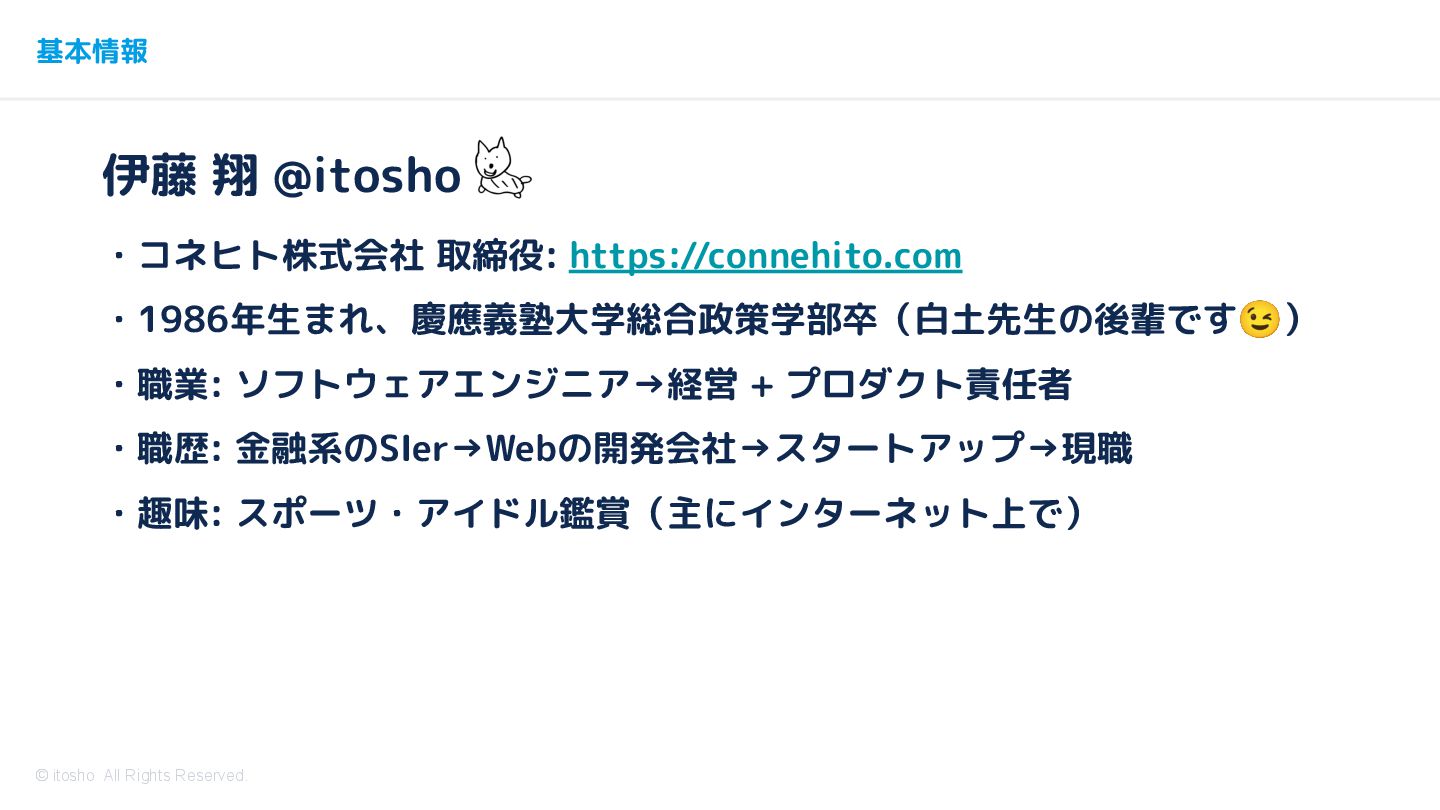 © itosho All Rights Reserved. 基本情報 伊藤 翔 @itosho ・コネヒト株式会社