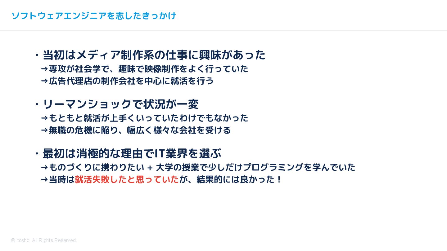 © itosho All Rights Reserved. ソフトウェアエンジニアを志したきっかけ ・当初はメディア制作系の仕事に興味があった →専攻が社会学で、趣味で映像制作をよく行っていた →広告代理店の制作会社を中心に就活を行う ・リーマンショックで状況が一変