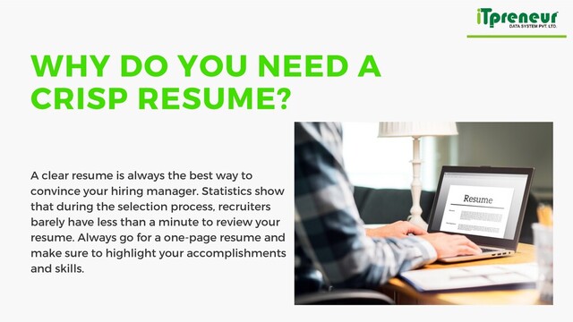 is always the best way to convince your hiring manager. Statistics show that during the selection process, recruiters barely have less than a minute to review your resume. Always go for a one-page resume and make sure to highlight your accomplishments and skills.