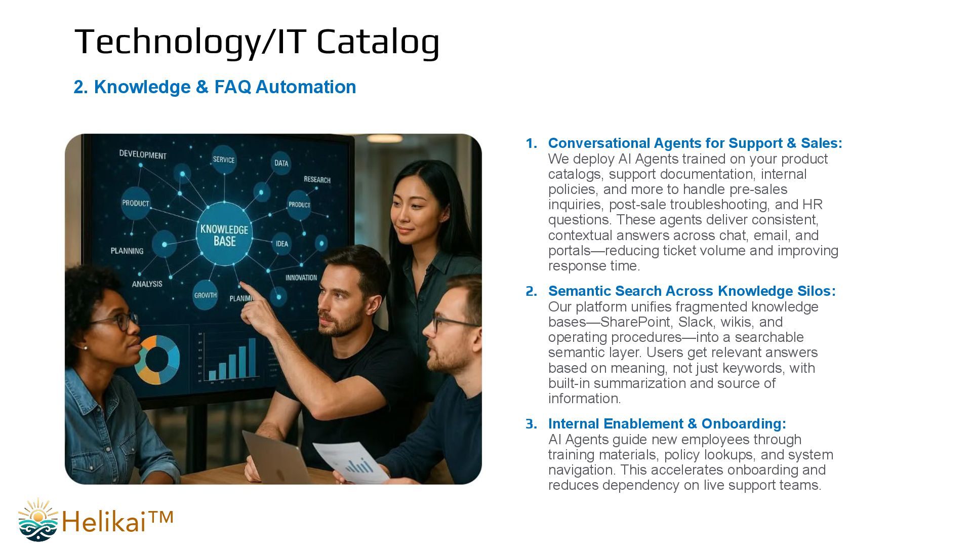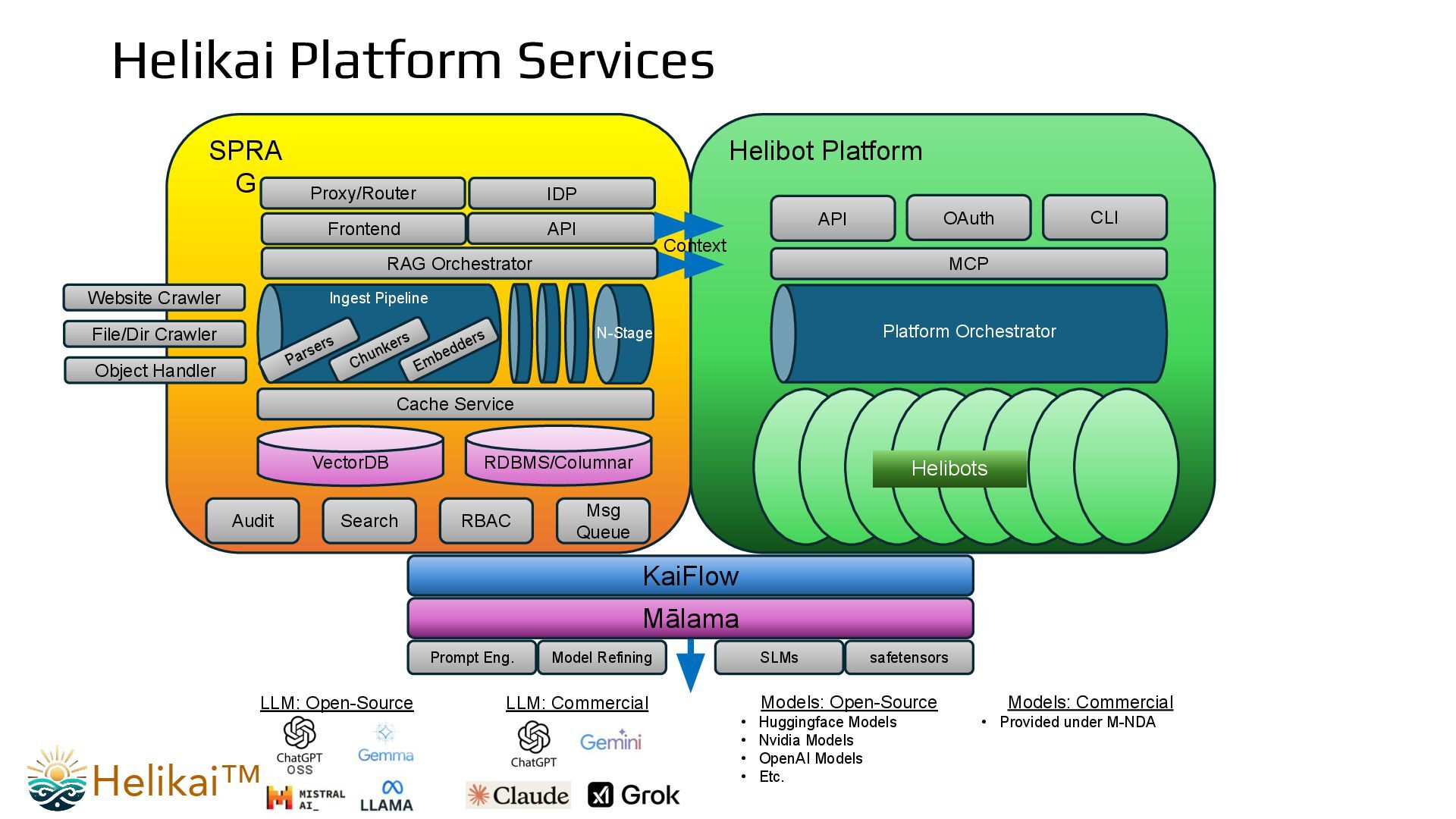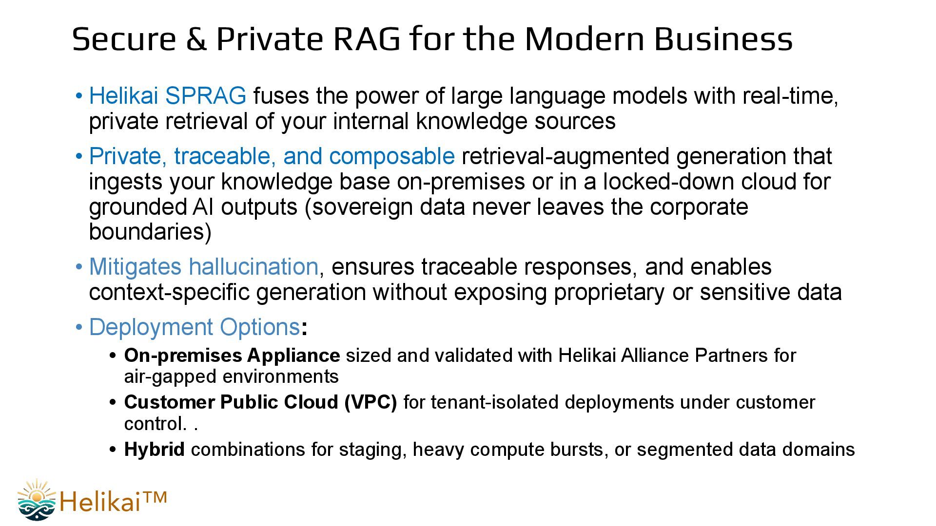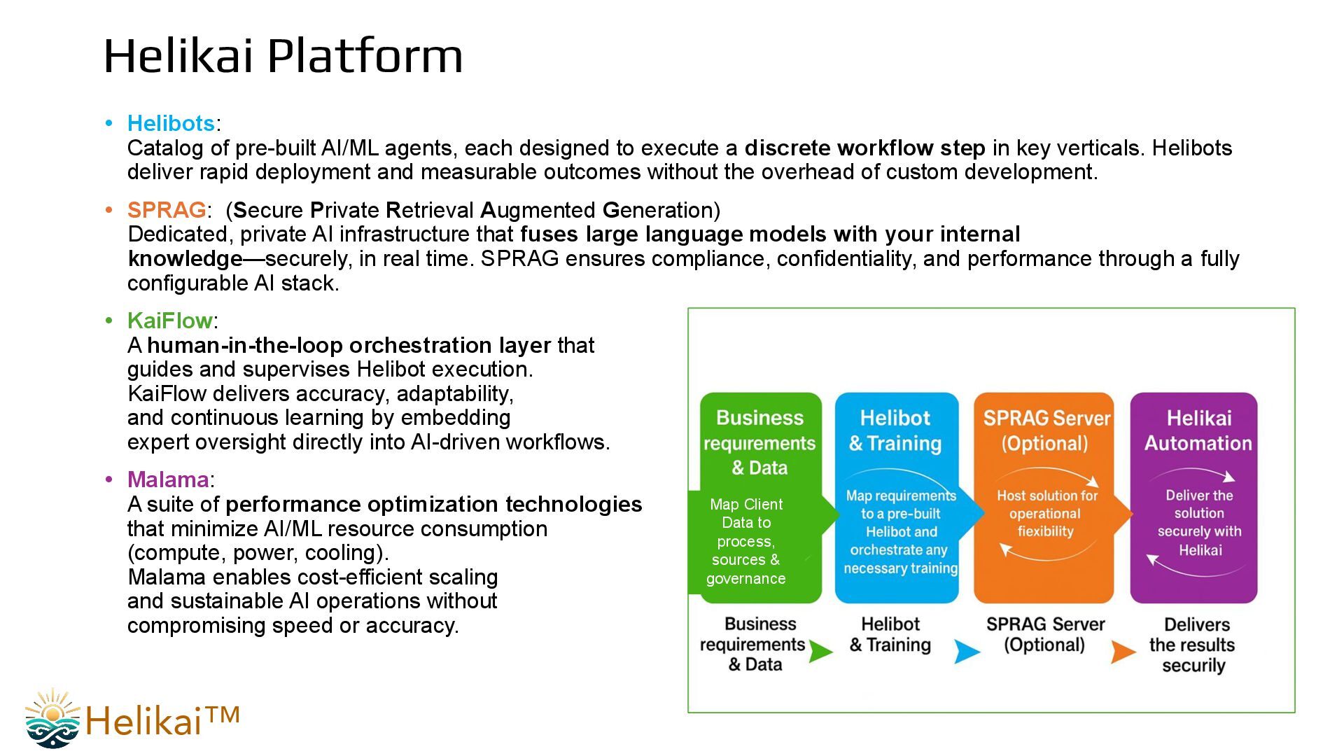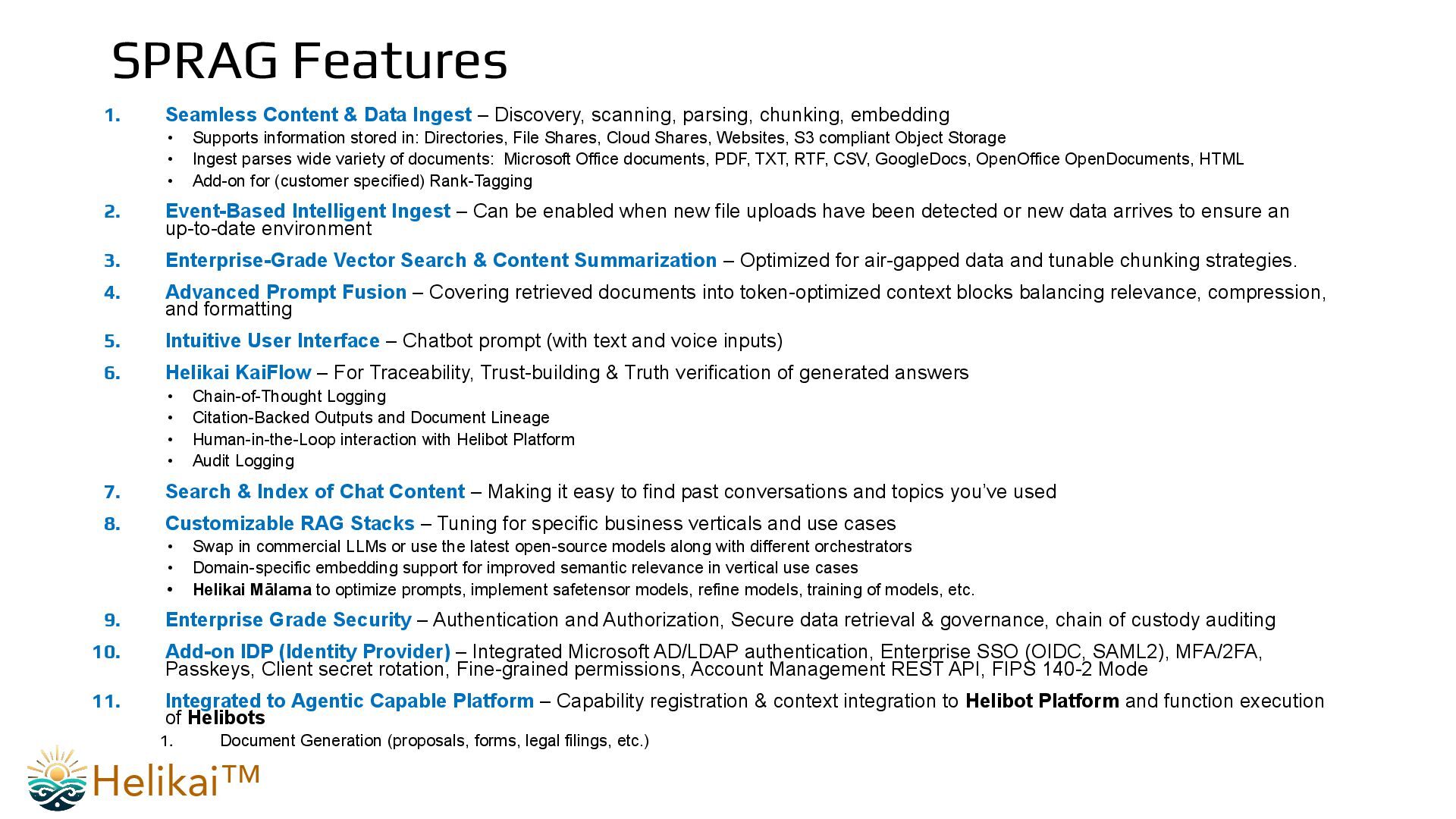 Discovery, scanning, parsing, chunking, embedding • Supports information stored in: Directories, File Shares, Cloud Shares, Websites, S3 compliant Object Storage • Ingest parses wide variety of documents: Microsoft Office documents, PDF, TXT, RTF, CSV, GoogleDocs, OpenOffice OpenDocuments, HTML • Add-on for (customer specified) Rank-Tagging 2. Event-Based Intelligent Ingest – Can be enabled when new file uploads have been detected or new data arrives to ensure an up-to-date environment 3. Enterprise-Grade Vector Search & Content Summarization – Optimized for air-gapped data and tunable chunking strategies. 4. Advanced Prompt Fusion – Covering retrieved documents into token-optimized context blocks balancing relevance, compression, and formatting 5. Intuitive User Interface – Chatbot prompt (with text and voice inputs) 6. Helikai KaiFlow – For Traceability, Trust-building & Truth verification of generated answers • Chain-of-Thought Logging • Citation-Backed Outputs and Document Lineage • Human-in-the-Loop interaction with Helibot Platform • Audit Logging 7. Search & Index of Chat Content – Making it easy to find past conversations and topics you’ve used 8. Customizable RAG Stacks – Tuning for specific business verticals and use cases • Swap in commercial LLMs or use the latest open-source models along with different orchestrators • Domain-specific embedding support for improved semantic relevance in vertical use cases • Helikai Mālama to optimize prompts, implement safetensor models, refine models, training of models, etc. 9. Enterprise Grade Security – Authentication and Authorization, Secure data retrieval & governance, chain of custody auditing 10. Add-on IDP (Identity Provider) – Integrated Microsoft AD/LDAP authentication, Enterprise SSO (OIDC, SAML2), MFA/2FA, Passkeys, Client secret rotation, Fine-grained permissions, Account Management REST API, FIPS 140-2 Mode 11. Integrated to Agentic Capable Platform – Capability registration & context integration to Helibot Platform and function execution of Helibots 1. Document Generation (proposals, forms, legal filings, etc.)