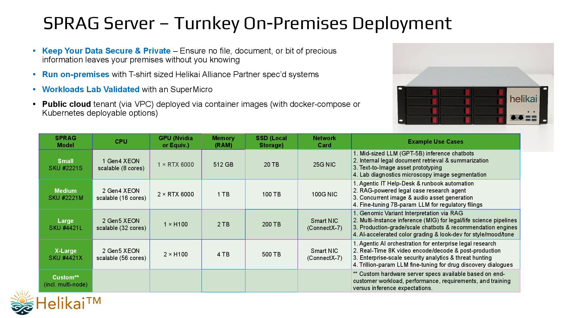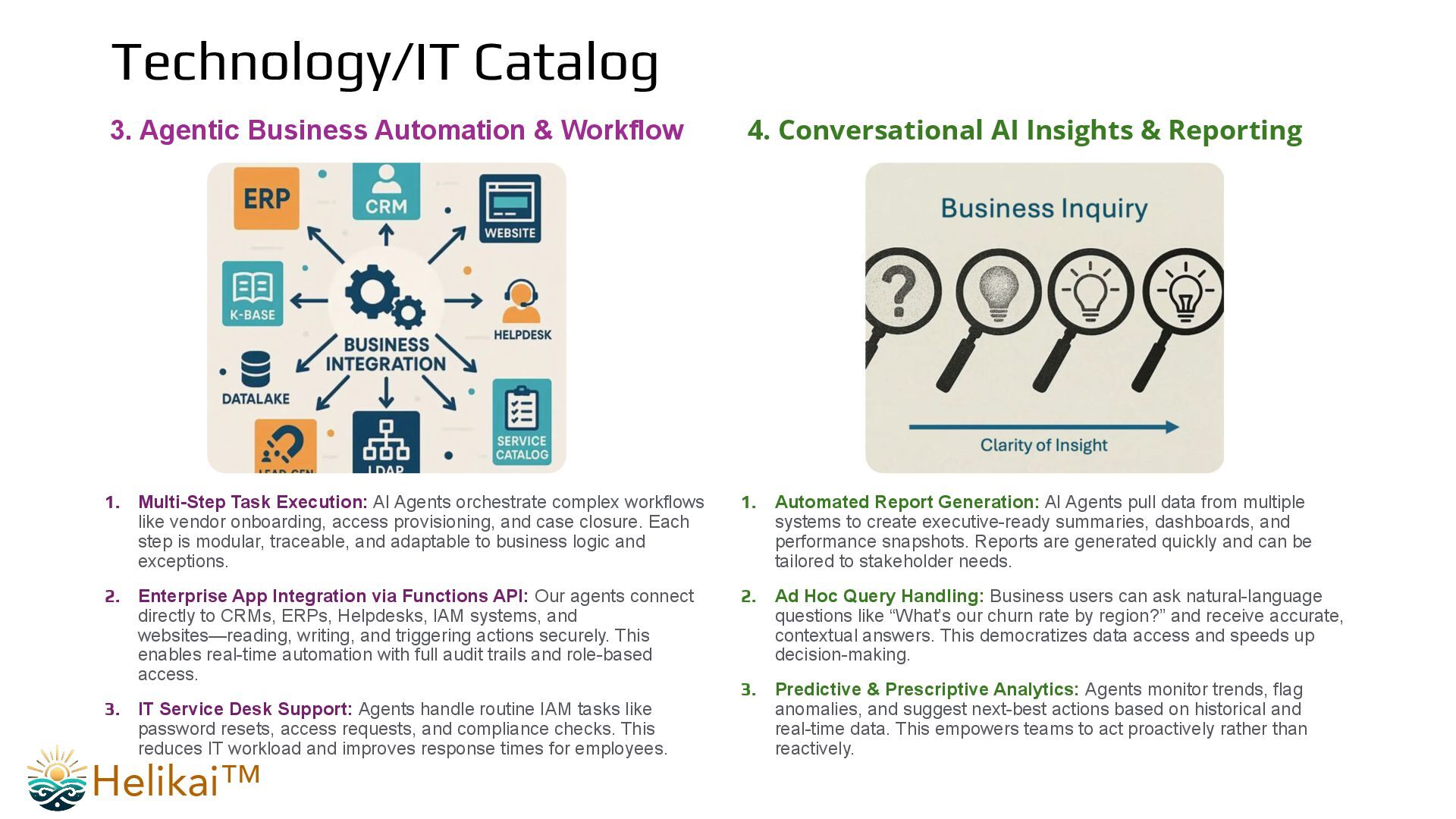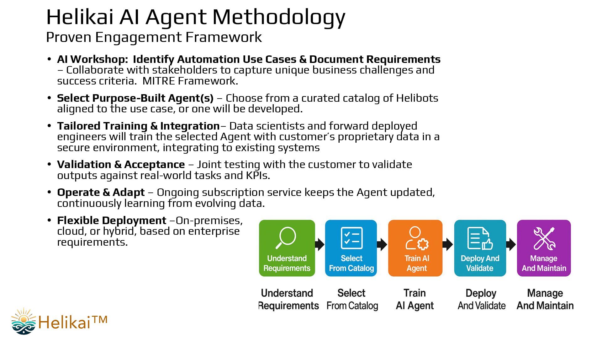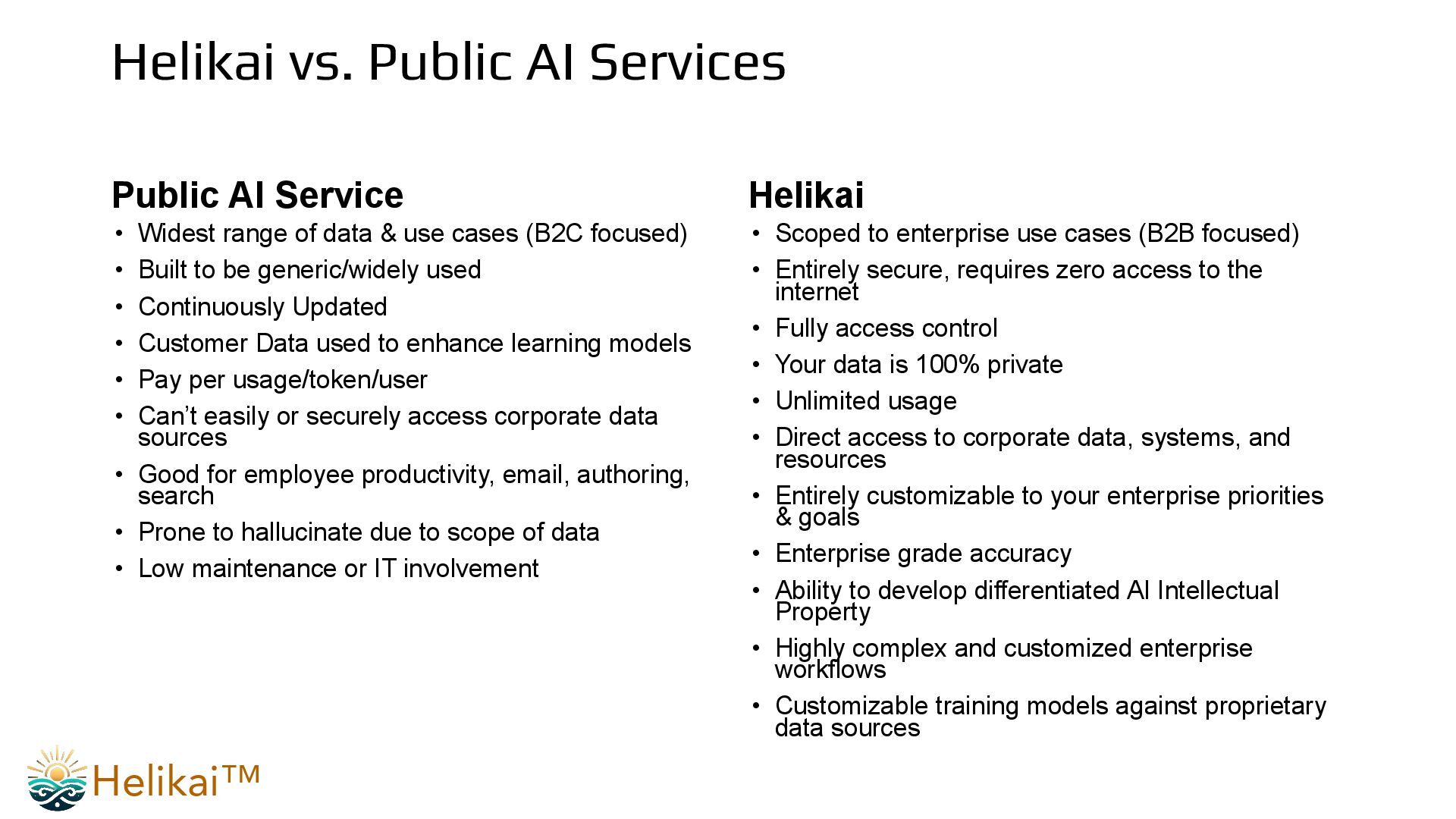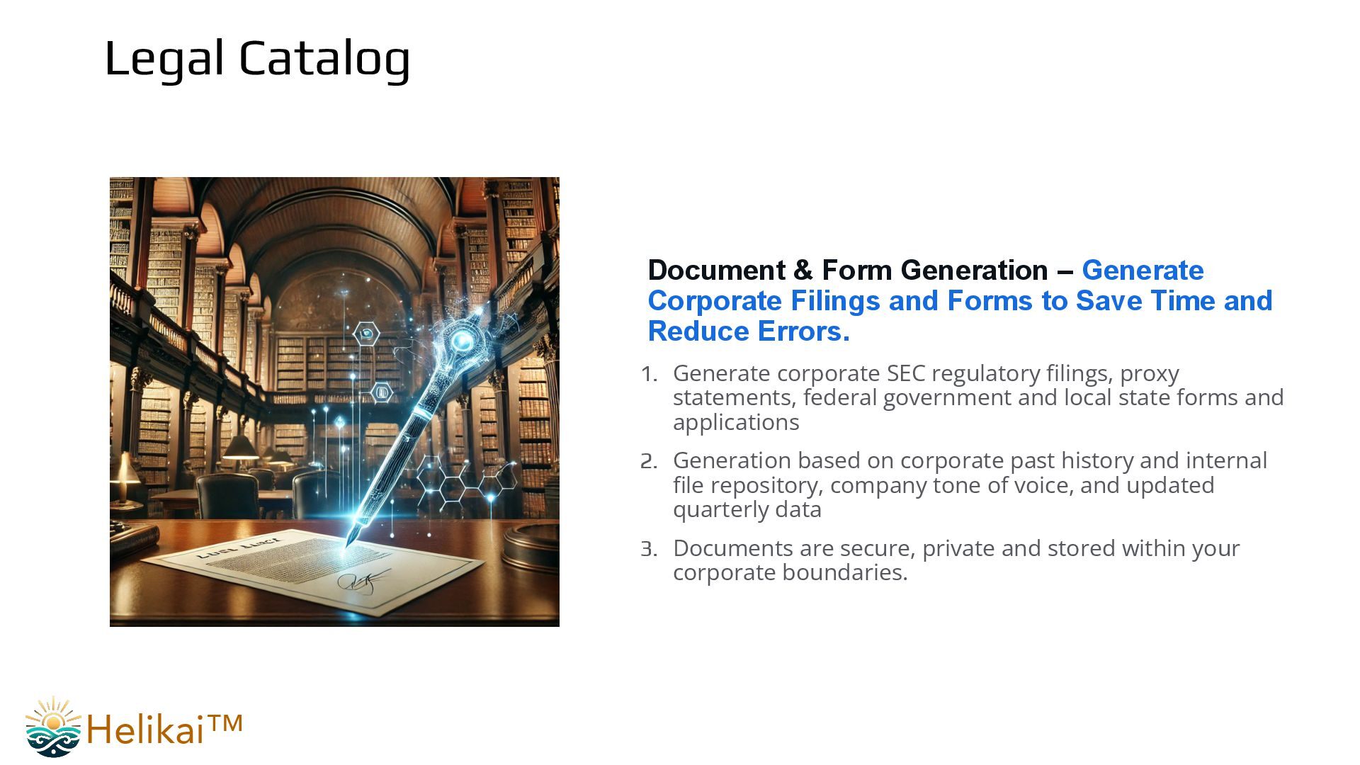 Discovery, scanning, parsing, chunking, embedding • Supports information stored in: Directories, File Shares, Cloud Shares, Websites, S3 compliant Object Storage • Ingest parses wide variety of documents: Microsoft Office documents, PDF, TXT, RTF, CSV, GoogleDocs, OpenOffice OpenDocuments, HTML • Add-on for (customer specified) Rank-Tagging 2. Event-Based Intelligent Ingest – Can be enabled when new file uploads have been detected or new data arrives to ensure an up-to-date environment 3. Enterprise-Grade Vector Search & Content Summarization – Optimized for air-gapped data and tunable chunking strategies. 4. Advanced Prompt Fusion – Covering retrieved documents into token-optimized context blocks balancing relevance, compression, and formatting 5. Intuitive User Interface – Chatbot prompt (with text and voice inputs) 6. Helikai KaiFlow – For Traceability, Trust-building & Truth verification of generated answers • Chain-of-Thought Logging • Citation-Backed Outputs and Document Lineage • Human-in-the-Loop interaction with Helibot Platform • Audit Logging 7. Search & Index of Chat Content – Making it easy to find past conversations and topics you’ve used 8. Customizable RAG Stacks – Tuning for specific business verticals and use cases • Swap in commercial LLMs or use the latest open-source models along with different orchestrators • Domain-specific embedding support for improved semantic relevance in vertical use cases • Helikai Mālama to optimize prompts, implement safetensor models, refine models, training of models, etc. 9. Enterprise Grade Security – Authentication and Authorization, Secure data retrieval & governance, chain of custody auditing 10. Add-on IDP (Identity Provider) – Integrated Microsoft AD/LDAP authentication, Enterprise SSO (OIDC, SAML2), MFA/2FA, Passkeys, Client secret rotation, Fine-grained permissions, Account Management REST API, FIPS 140-2 Mode 11. Integrated to Agentic Capable Platform – Capability registration & context integration to Helibot Platform and function execution of Helibots 1. Document Generation (proposals, forms, legal filings, etc.)