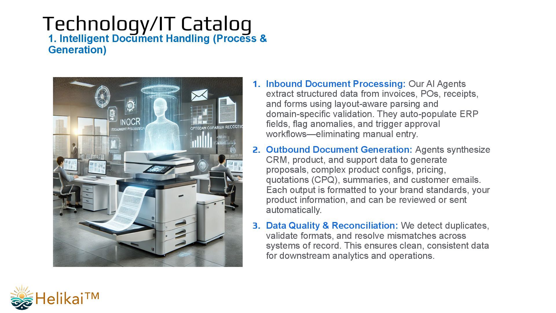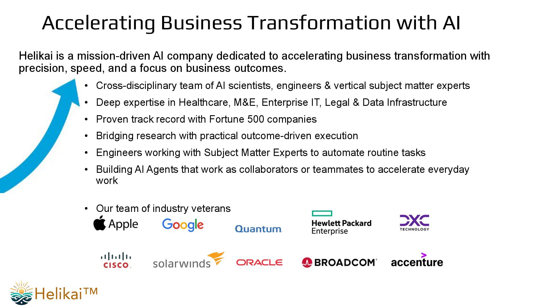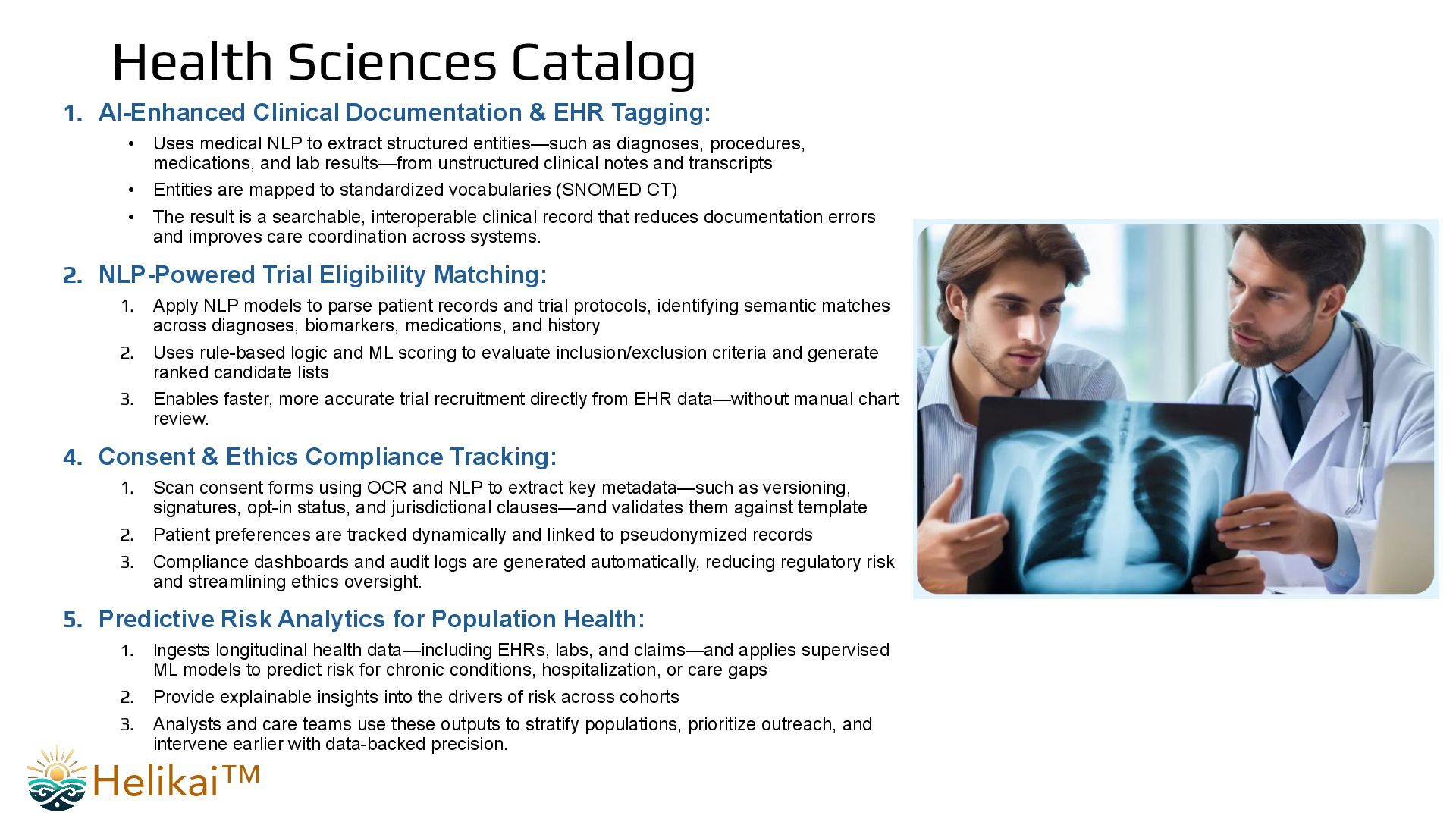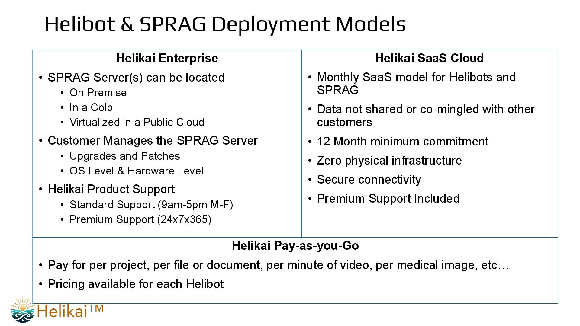 Discovery, scanning, parsing, chunking, embedding • Supports information stored in: Directories, File Shares, Cloud Shares, Websites, S3 compliant Object Storage • Ingest parses wide variety of documents: Microsoft Office documents, PDF, TXT, RTF, CSV, GoogleDocs, OpenOffice OpenDocuments, HTML • Add-on for (customer specified) Rank-Tagging 2. Event-Based Intelligent Ingest – Can be enabled when new file uploads have been detected or new data arrives to ensure an up-to-date environment 3. Enterprise-Grade Vector Search & Content Summarization – Optimized for air-gapped data and tunable chunking strategies. 4. Advanced Prompt Fusion – Covering retrieved documents into token-optimized context blocks balancing relevance, compression, and formatting 5. Intuitive User Interface – Chatbot prompt (with text and voice inputs) 6. Helikai KaiFlow – For Traceability, Trust-building & Truth verification of generated answers • Chain-of-Thought Logging • Citation-Backed Outputs and Document Lineage • Human-in-the-Loop interaction with Helibot Platform • Audit Logging 7. Search & Index of Chat Content – Making it easy to find past conversations and topics you’ve used 8. Customizable RAG Stacks – Tuning for specific business verticals and use cases • Swap in commercial LLMs or use the latest open-source models along with different orchestrators • Domain-specific embedding support for improved semantic relevance in vertical use cases • Helikai Mālama to optimize prompts, implement safetensor models, refine models, training of models, etc. 9. Enterprise Grade Security – Authentication and Authorization, Secure data retrieval & governance, chain of custody auditing 10. Add-on IDP (Identity Provider) – Integrated Microsoft AD/LDAP authentication, Enterprise SSO (OIDC, SAML2), MFA/2FA, Passkeys, Client secret rotation, Fine-grained permissions, Account Management REST API, FIPS 140-2 Mode 11. Integrated to Agentic Capable Platform – Capability registration & context integration to Helibot Platform and function execution of Helibots 1. Document Generation (proposals, forms, legal filings, etc.)