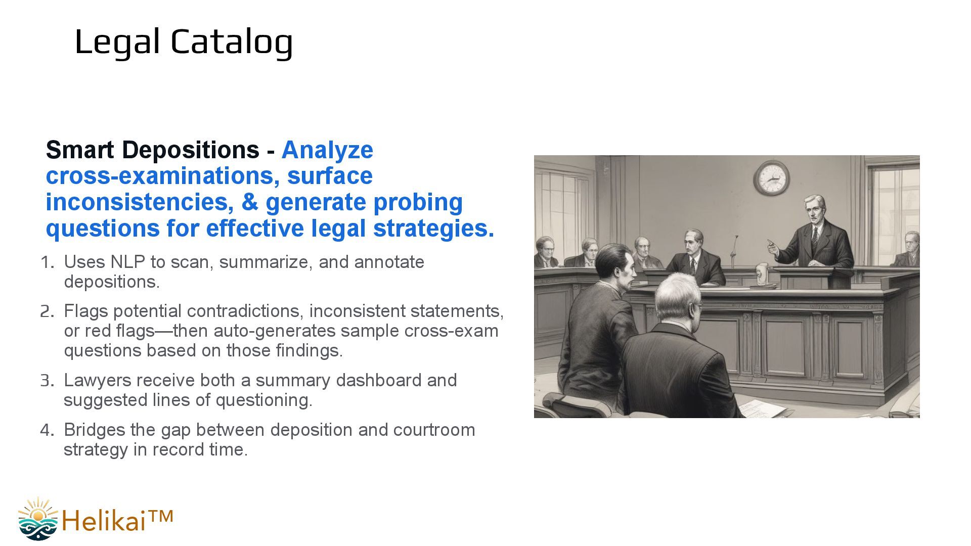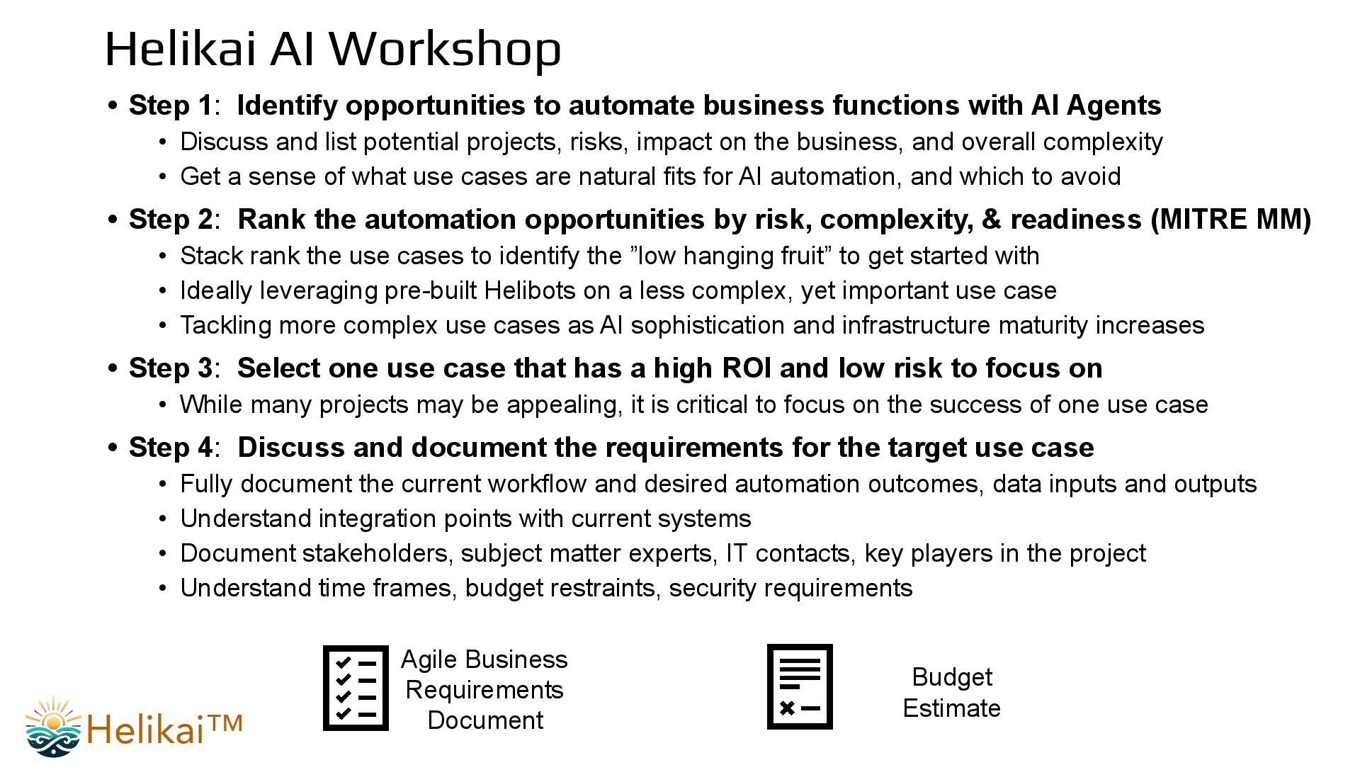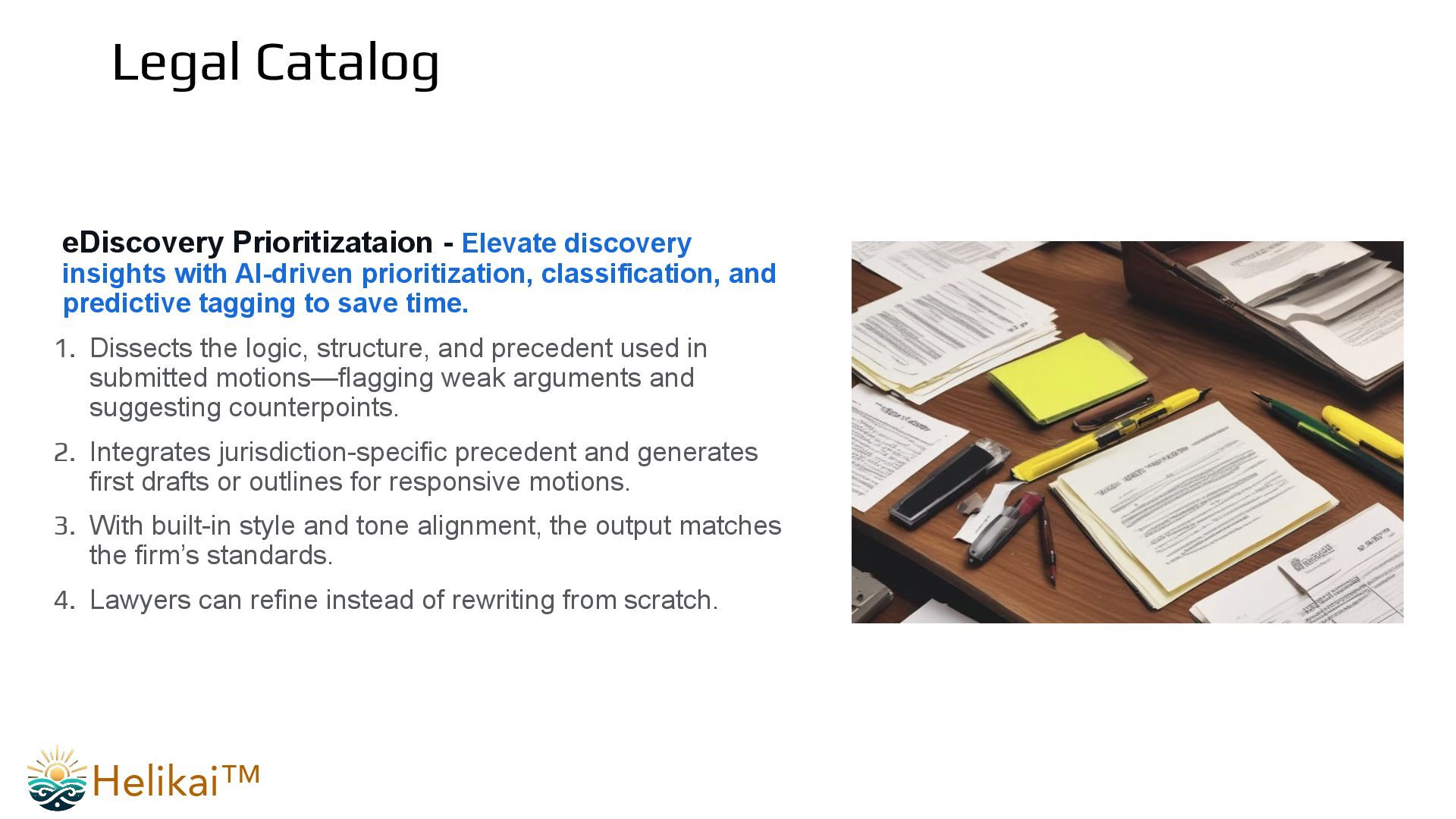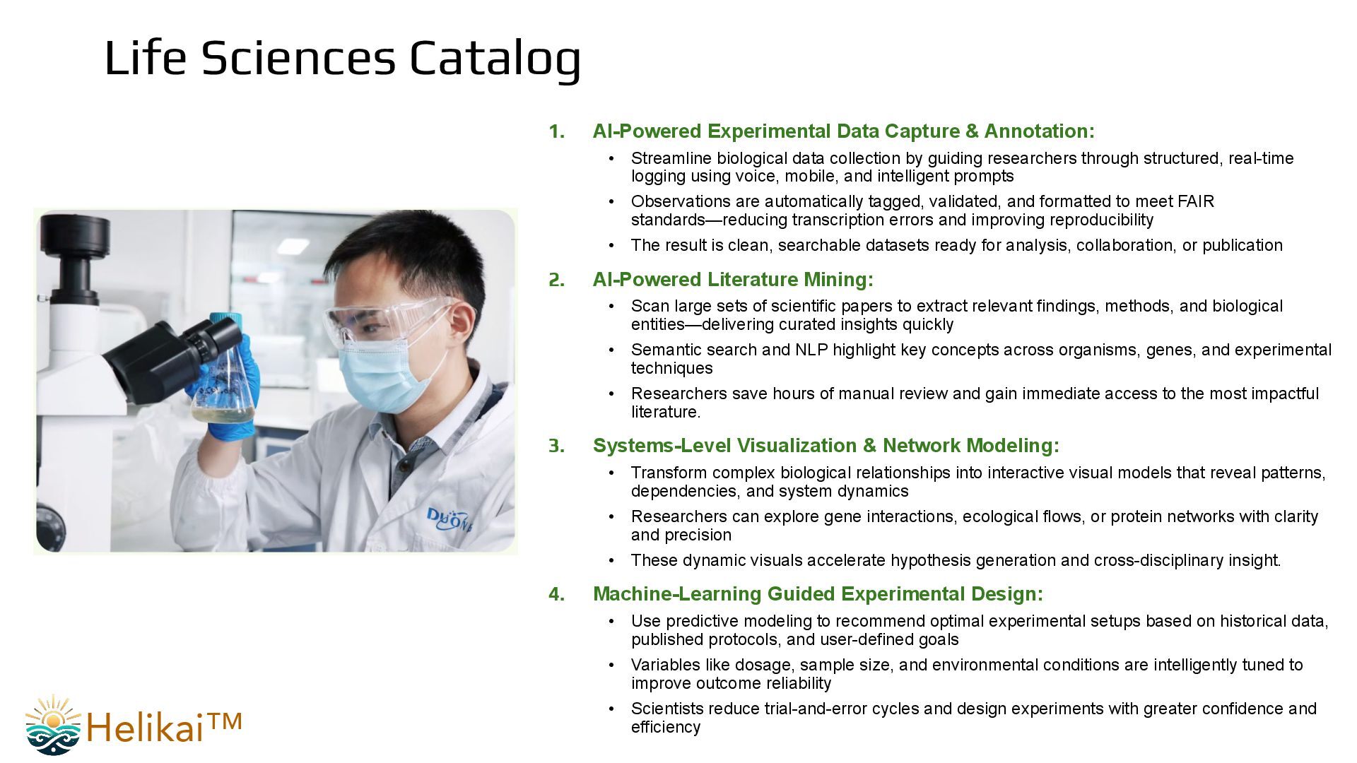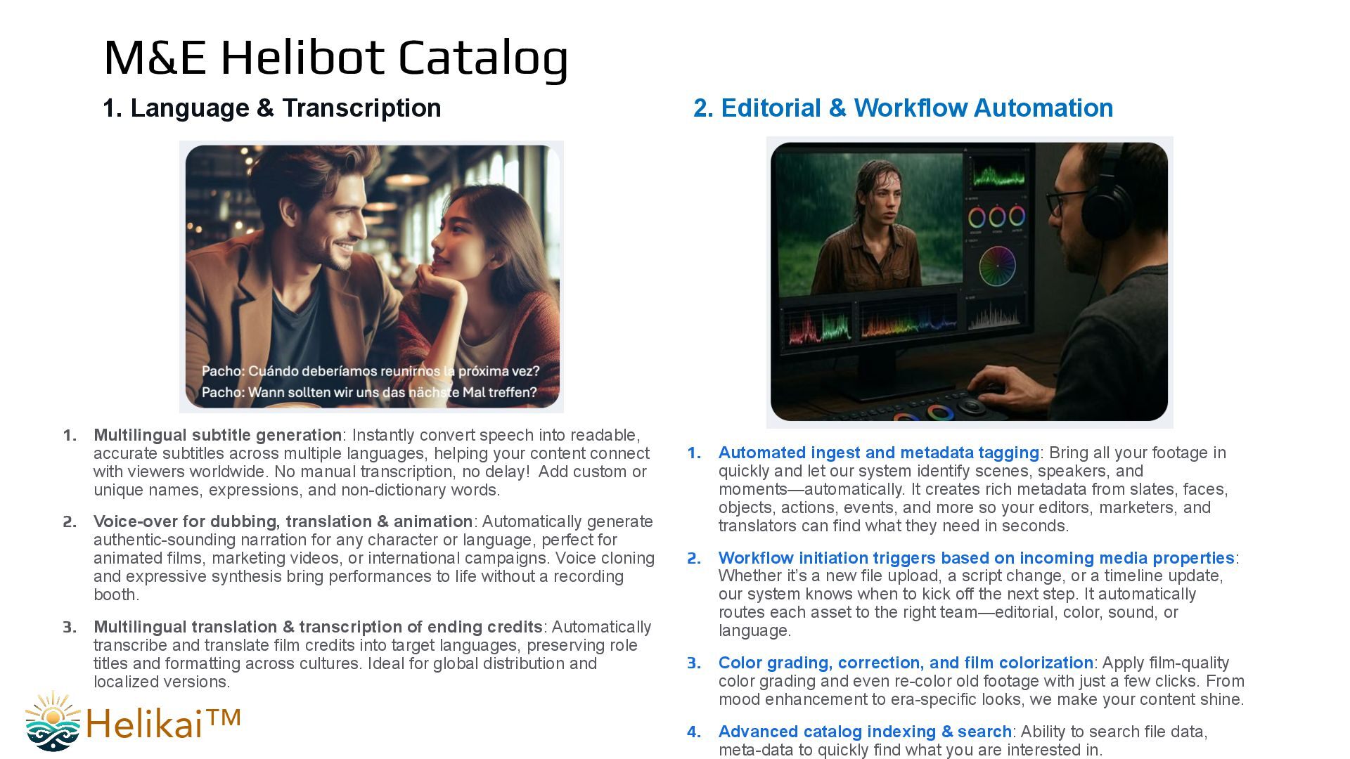 Discovery, scanning, parsing, chunking, embedding • Supports information stored in: Directories, File Shares, Cloud Shares, Websites, S3 compliant Object Storage • Ingest parses wide variety of documents: Microsoft Office documents, PDF, TXT, RTF, CSV, GoogleDocs, OpenOffice OpenDocuments, HTML • Add-on for (customer specified) Rank-Tagging 2. Event-Based Intelligent Ingest – Can be enabled when new file uploads have been detected or new data arrives to ensure an up-to-date environment 3. Enterprise-Grade Vector Search & Content Summarization – Optimized for air-gapped data and tunable chunking strategies. 4. Advanced Prompt Fusion – Covering retrieved documents into token-optimized context blocks balancing relevance, compression, and formatting 5. Intuitive User Interface – Chatbot prompt (with text and voice inputs) 6. Helikai KaiFlow – For Traceability, Trust-building & Truth verification of generated answers • Chain-of-Thought Logging • Citation-Backed Outputs and Document Lineage • Human-in-the-Loop interaction with Helibot Platform • Audit Logging 7. Search & Index of Chat Content – Making it easy to find past conversations and topics you’ve used 8. Customizable RAG Stacks – Tuning for specific business verticals and use cases • Swap in commercial LLMs or use the latest open-source models along with different orchestrators • Domain-specific embedding support for improved semantic relevance in vertical use cases • Helikai Mālama to optimize prompts, implement safetensor models, refine models, training of models, etc. 9. Enterprise Grade Security – Authentication and Authorization, Secure data retrieval & governance, chain of custody auditing 10. Add-on IDP (Identity Provider) – Integrated Microsoft AD/LDAP authentication, Enterprise SSO (OIDC, SAML2), MFA/2FA, Passkeys, Client secret rotation, Fine-grained permissions, Account Management REST API, FIPS 140-2 Mode 11. Integrated to Agentic Capable Platform – Capability registration & context integration to Helibot Platform and function execution of Helibots 1. Document Generation (proposals, forms, legal filings, etc.)