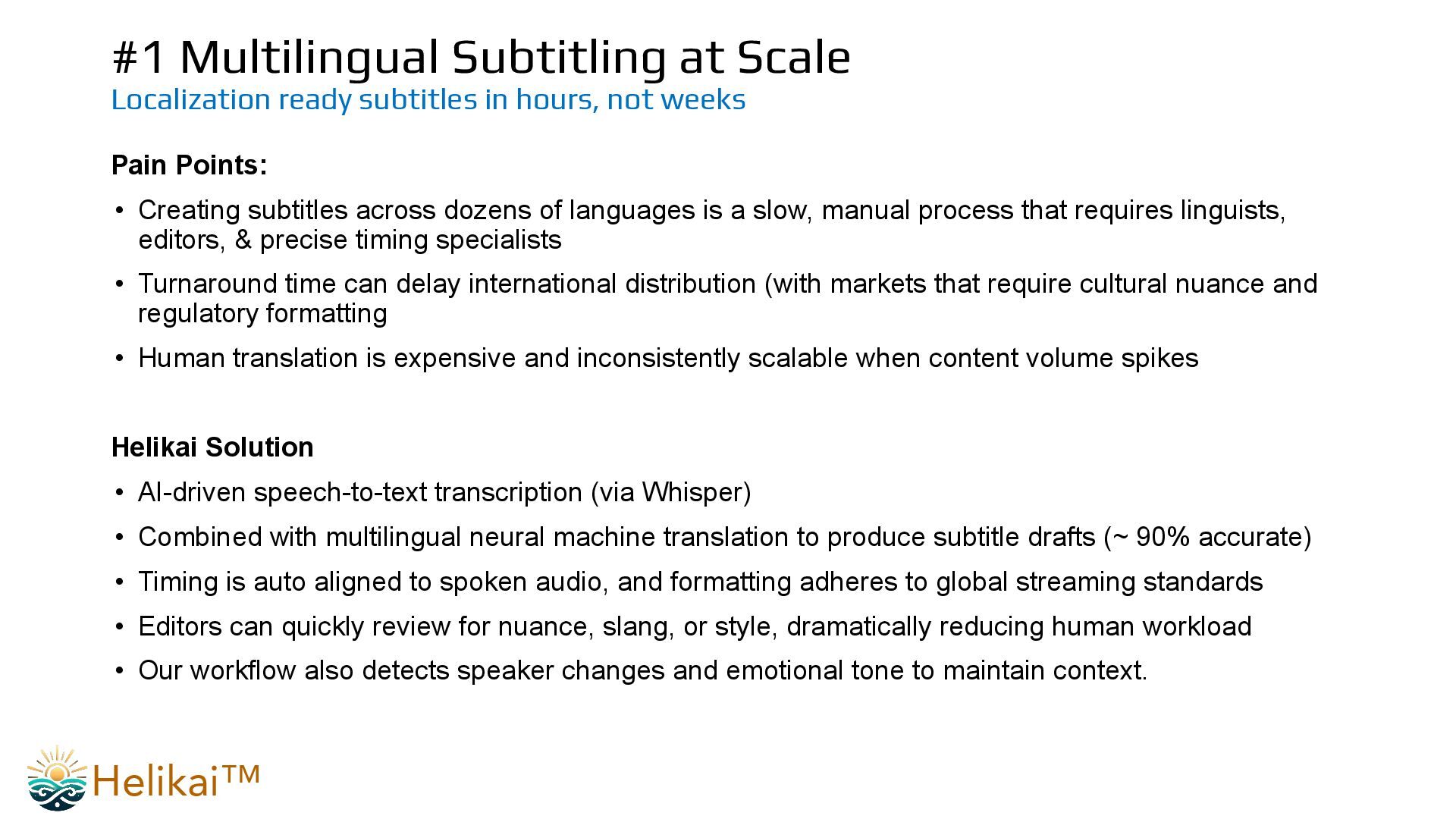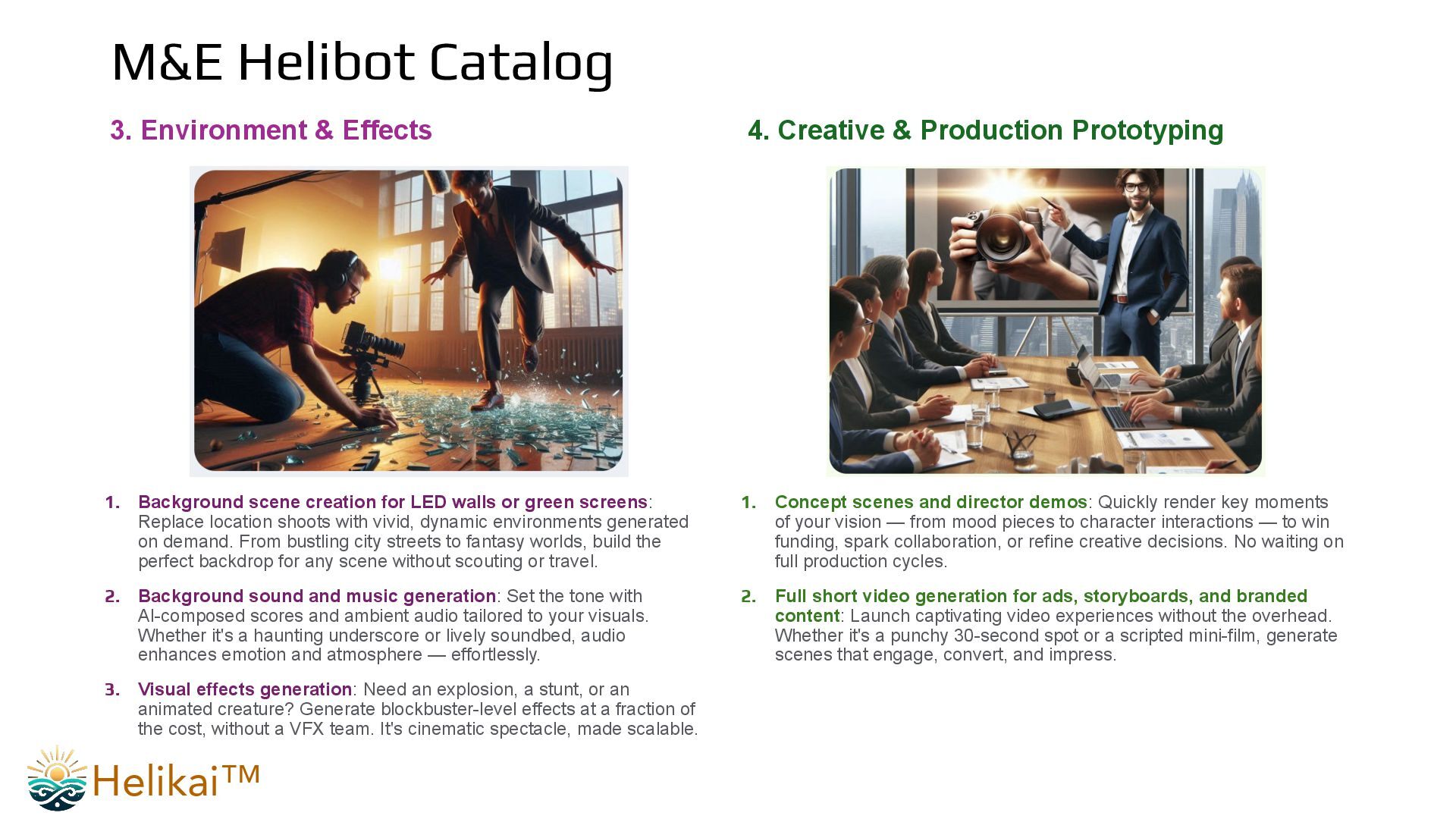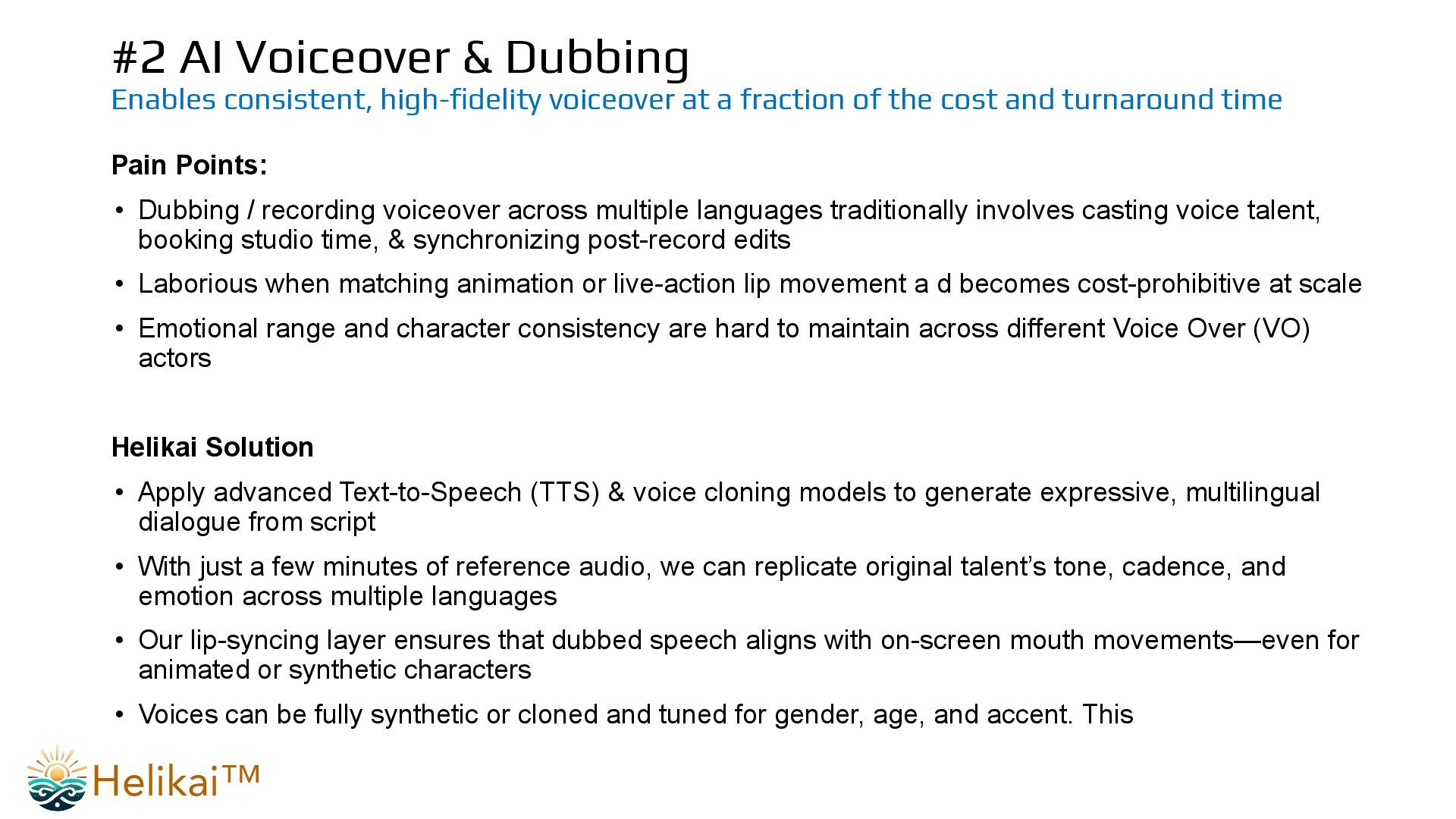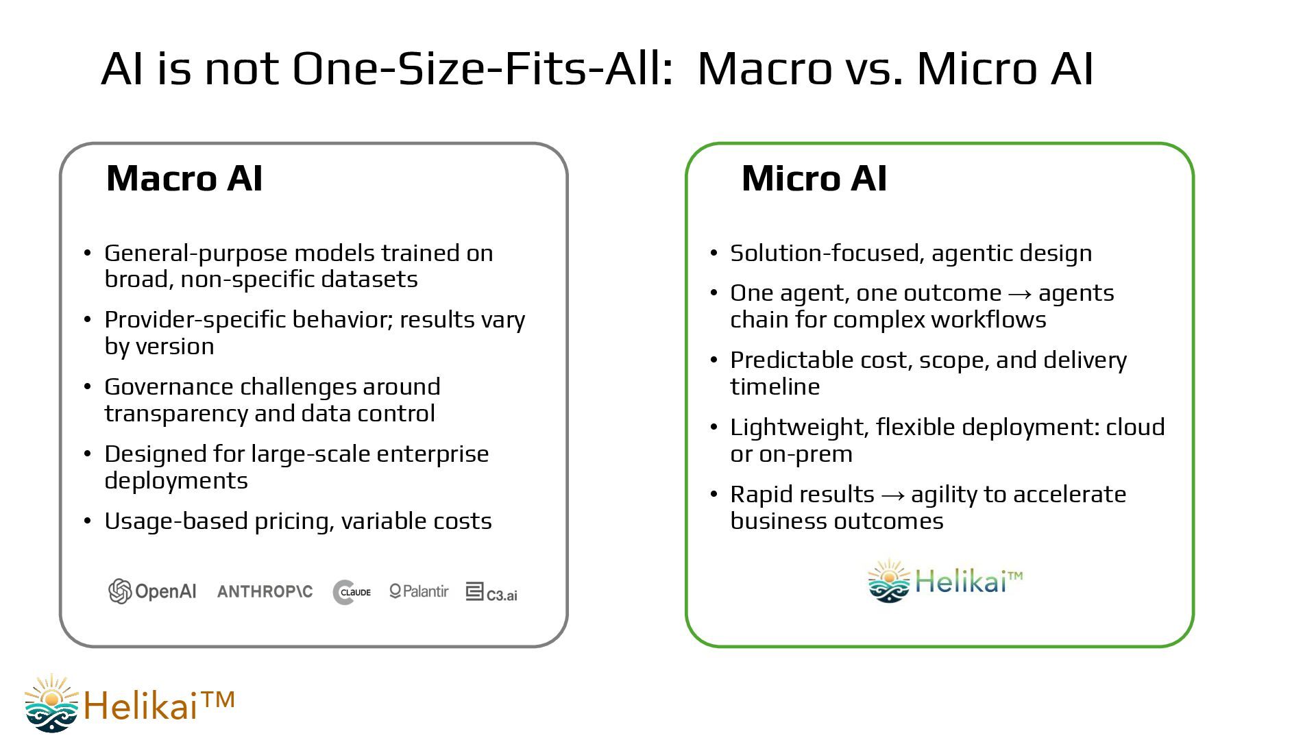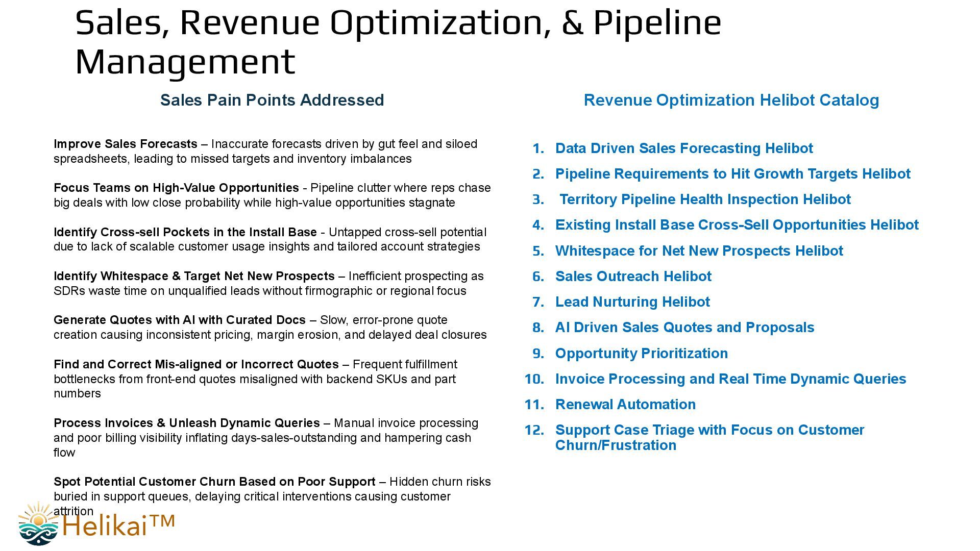 Discovery, scanning, parsing, chunking, embedding • Supports information stored in: Directories, File Shares, Cloud Shares, Websites, S3 compliant Object Storage • Ingest parses wide variety of documents: Microsoft Office documents, PDF, TXT, RTF, CSV, GoogleDocs, OpenOffice OpenDocuments, HTML • Add-on for (customer specified) Rank-Tagging 2. Event-Based Intelligent Ingest – Can be enabled when new file uploads have been detected or new data arrives to ensure an up-to-date environment 3. Enterprise-Grade Vector Search & Content Summarization – Optimized for air-gapped data and tunable chunking strategies. 4. Advanced Prompt Fusion – Covering retrieved documents into token-optimized context blocks balancing relevance, compression, and formatting 5. Intuitive User Interface – Chatbot prompt (with text and voice inputs) 6. Helikai KaiFlow – For Traceability, Trust-building & Truth verification of generated answers • Chain-of-Thought Logging • Citation-Backed Outputs and Document Lineage • Human-in-the-Loop interaction with Helibot Platform • Audit Logging 7. Search & Index of Chat Content – Making it easy to find past conversations and topics you’ve used 8. Customizable RAG Stacks – Tuning for specific business verticals and use cases • Swap in commercial LLMs or use the latest open-source models along with different orchestrators • Domain-specific embedding support for improved semantic relevance in vertical use cases • Helikai Mālama to optimize prompts, implement safetensor models, refine models, training of models, etc. 9. Enterprise Grade Security – Authentication and Authorization, Secure data retrieval & governance, chain of custody auditing 10. Add-on IDP (Identity Provider) – Integrated Microsoft AD/LDAP authentication, Enterprise SSO (OIDC, SAML2), MFA/2FA, Passkeys, Client secret rotation, Fine-grained permissions, Account Management REST API, FIPS 140-2 Mode 11. Integrated to Agentic Capable Platform – Capability registration & context integration to Helibot Platform and function execution of Helibots 1. Document Generation (proposals, forms, legal filings, etc.)
