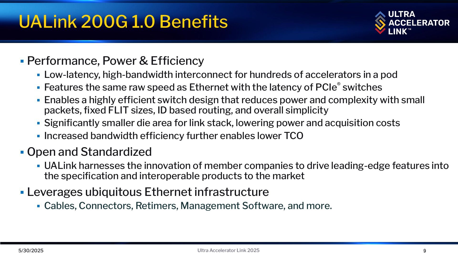 hundreds of accelerators in a pod ▪ Features the same raw speed as Ethernet with the latency of PCIe® switches ▪ Enables a highly efficient switch design that reduces power and complexity with small packets, fixed FLIT sizes, ID based routing, and overall simplicity ▪ Significantly smaller die area for link stack, lowering power and acquisition costs ▪ Increased bandwidth efficiency further enables lower TCO ▪ Open and Standardized ▪ UALink harnesses the innovation of member companies to drive leading-edge features into the specification and interoperable products to the market ▪ Leverages ubiquitous Ethernet infrastructure ▪ Cables, Connectors, Retimers, Management Software, and more. UALink 200G 1.0 Benefits 5/30/2025 9 Ultra Accelerator Link 2025